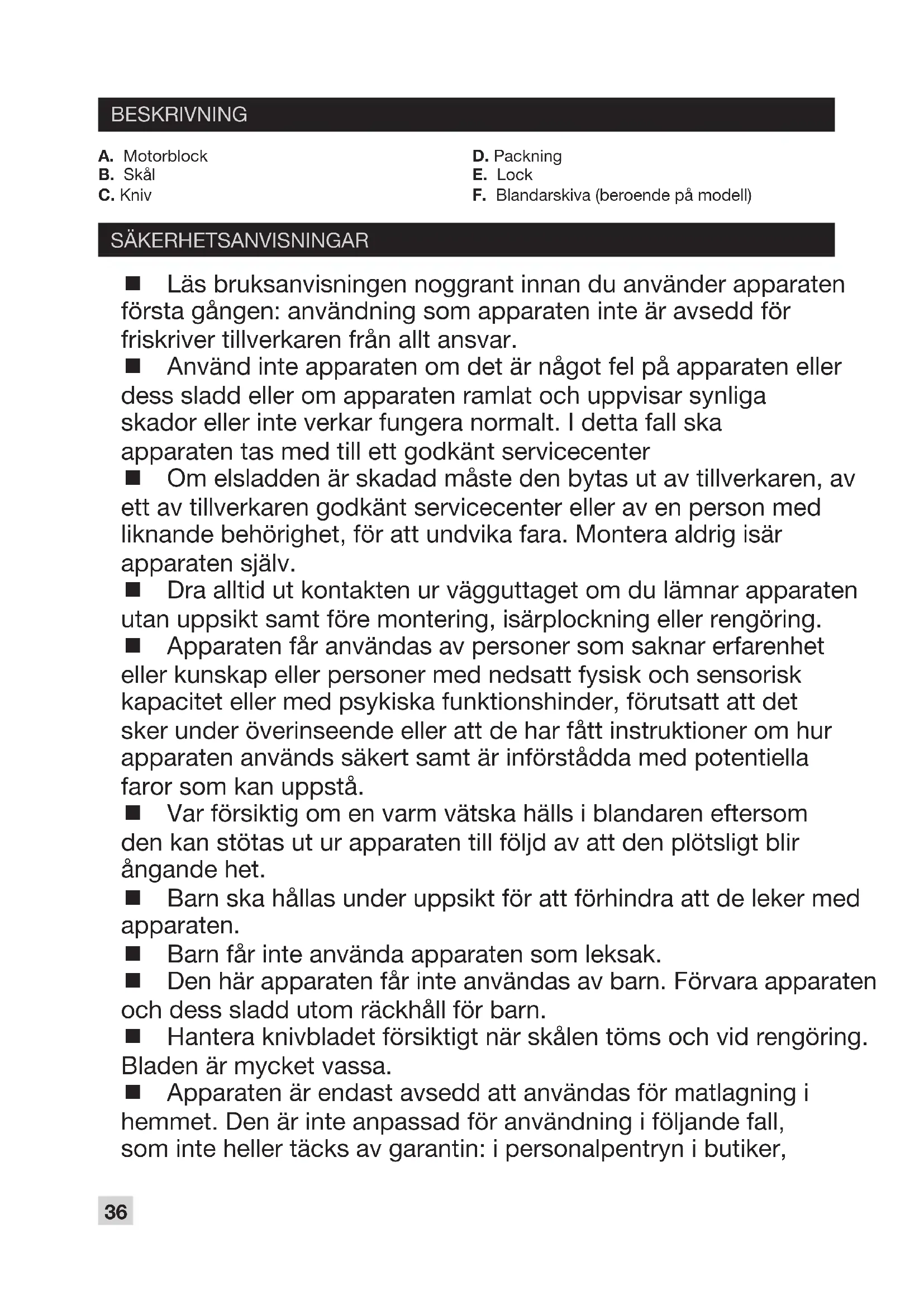 MAJONESER PISKET KREM 20 cl øte med 35 % fett. 20 sukker eller 20 melis og 1 ts vaniljesukker. Råd for å lykkes med ott, fast pisket krem. Bruk kald øte rett fra kjøleskapet. Råd for å lykkes med otte, faste piskede majoneser: - Bruk ingredienser med romtemperatur. - Rengjør begeret og platen med kaldt vann. - Overhold mengdene ingredienser angitt i hver oppskrift. Sett blandeskiven på plass i begeret. Hell i ingrediensene. Lås lokket. La apparatet gå på kontinuerlig drift i 30 sekunder for å oppnå en øyelsaktig krem eller i ca. 1 minutt for å oppnå pisket krem. NB: Sjekk konsistensen på tilberedningen etter 45 sekunder. Hvis du blander for lenge, vil du få smør. Majones med sennep Sett blandeskiven på plass i begeret. Hell i ingrediensene: 1 eggeplomme, 1 spiseskje sennep, 1/2 spiseskje vineddik, salt og pepper, 3 spiseskjeer olje. Lås lokket. La apparatet gå i 15 sekunder. Hell i ca. 30 ml olje. La det så gå i ca. 20-50 sekunder. Pannekakerøre For 4 dl røre: 80 g mel, 2 egg, 1/2 teskje olje, aroma. Ha alle ingrediensene i begeret og bland til du oppnår en jevn røre, dvs. ca. 10-15 sekunder. Vaffelrøre (til rkantede belgiske vaer) 80 g mel, 5 g gjær, 1 egg, 120 ml melk, 35 g smeltet smør, 1 spiseskje vaniljesukker. Løs opp gjæren i litt lunkent vann, ha alle ingrediensene i begeret og bland til røren blir helt jevn, dvs. ca. 15-20 sekunder, la stå i 1 time. Majones uten sennep Gå fram på samme måte som for majones med sennep ved å bytte ut sennep med 3 spiseskjeer sitronsaft. Hvis du ønsker å øke mengden majones, tilsetter du olje (ca. 30 ml) og lar apparatet gå i 15 sekunder til.36 BESKRIVNING SÄKERHETSANVISNINGAR A. Motorblock B. Skål C. Kniv D. Packning E. Lock F. Blandarskiva (beroende på modell) Läs bruksanvisningen noggrant innan du använder apparaten första gången: användning som apparaten inte är avsedd för friskriver tillverkaren från allt ansvar. Använd inte apparaten om det är något fel på apparaten eller dess sladd eller om apparaten ramlat och uppvisar synliga skador eller inte verkar fungera normalt. I detta fall ska apparaten tas med till ett godkänt servicecenter Om elsladden är skadad måste den bytas ut av tillverkaren, av ett av tillverkaren godkänt servicecenter eller av en person med liknande behörighet, för att undvika fara. Montera aldrig isär apparaten själv. Dra alltid ut kontakten ur vägguttaget om du lämnar apparaten utan uppsikt samt före montering, isärplockning eller rengöring. Apparaten får användas av personer som saknar erfarenhet eller kunskap eller personer med nedsatt fysisk och sensorisk kapacitet eller med psykiska funktionshinder, förutsatt att det sker under överinseende eller att de har fått instruktioner om hur apparaten används säkert samt är införstådda med potentiella faror som kan uppstå. Var försiktig om en varm vätska hälls i blandaren eftersom den kan stötas ut ur apparaten till följd av att den plötsligt blir ångande het. Barn ska hållas under uppsikt för att förhindra att de leker med apparaten. Barn får inte använda apparaten som leksak. Den här apparaten får inte användas av barn. Förvara apparaten och dess sladd utom räckhåll för barn. Hantera knivbladet försiktigt när skålen töms och vid rengöring. Bladen är mycket vassa. Apparaten är endast avsedd att användas för matlagning i hemmet. Den är inte anpassad för användning i följande fall, som inte heller täcks av garantin: i personalpentryn i butiker,37