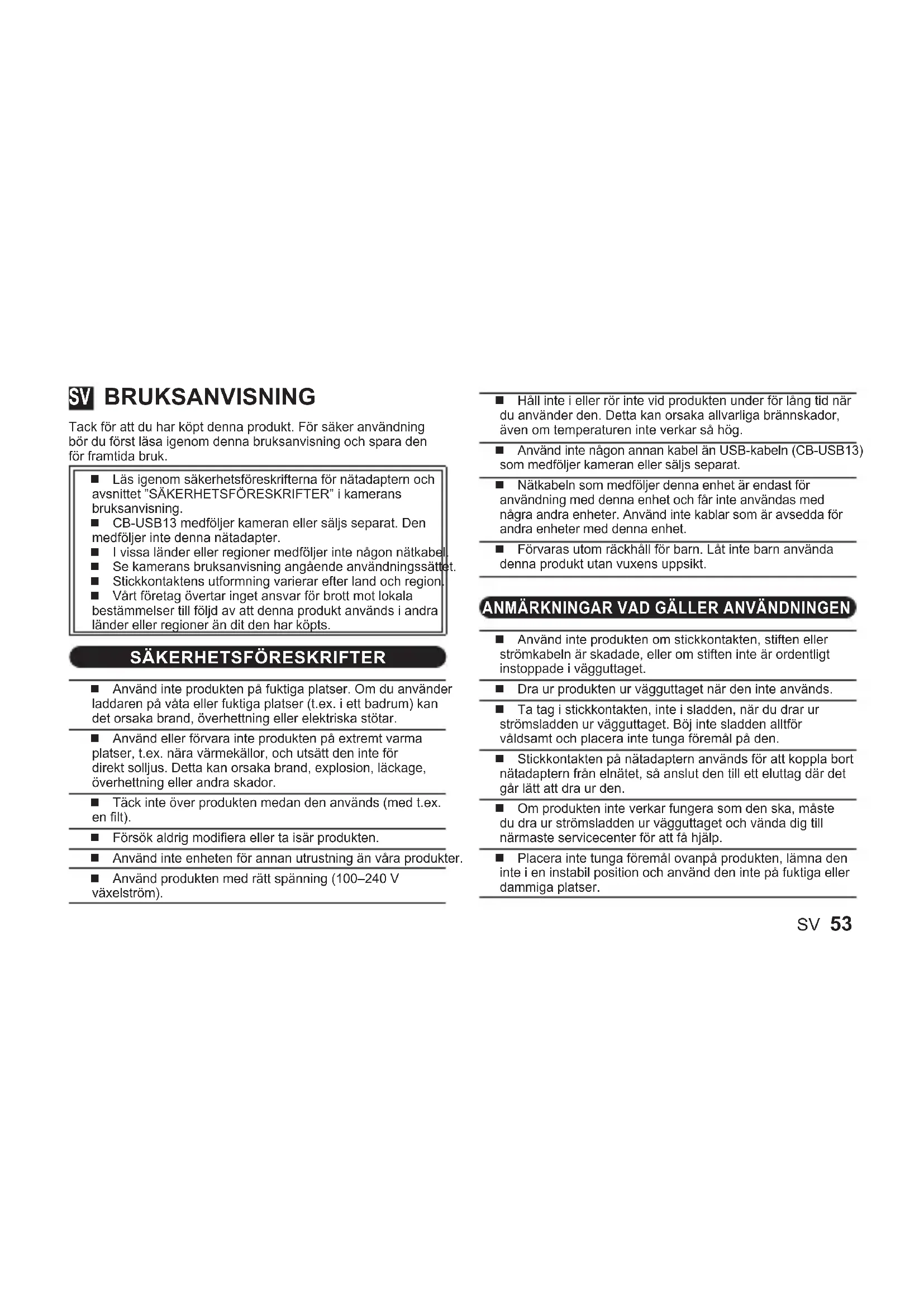 - brez napajalnega kabla Datum proizvodnje je označen na ohišju napajalnika. Oblika in specikacije se lahko spremenijo brez predhodnega obvestila. Za stranke v Evropi Ta simbol [prečrtani smetnjak na kolesih, Priloga IV k Direktivi o OEEO] nakazuje ločeno zbiranje odpadne električne in elektronske opreme v državah EU. Opreme ne odvrzite med gospodinjske odpadke. Za odstranjevanje tega izdelka uporabite sisteme za vračanje in zbiranje odpadkov, ki so na voljo v vaši državi.SV 53 BRUKSANVISNING Tack för att du har köpt denna produkt. För säker användning bör du först läsa igenom denna bruksanvisning och spara den för framtida bruk. Läs igenom säkerhetsföreskrifterna för nätadaptern och avsnittet ”SÄKERHETSFÖRESKRIFTER” i kamerans bruksanvisning. CB-USB13 medföljer kameran eller säljs separat. Den medföljer inte denna nätadapter. I vissa länder eller regioner medföljer inte någon nätkabel. Se kamerans bruksanvisning angående användningssättet. Stickkontaktens utformning varierar efter land och region. Vårt företag övertar inget ansvar för brott mot lokala bestämmelser till följd av att denna produkt används i andra länder eller regioner än dit den har köpts.