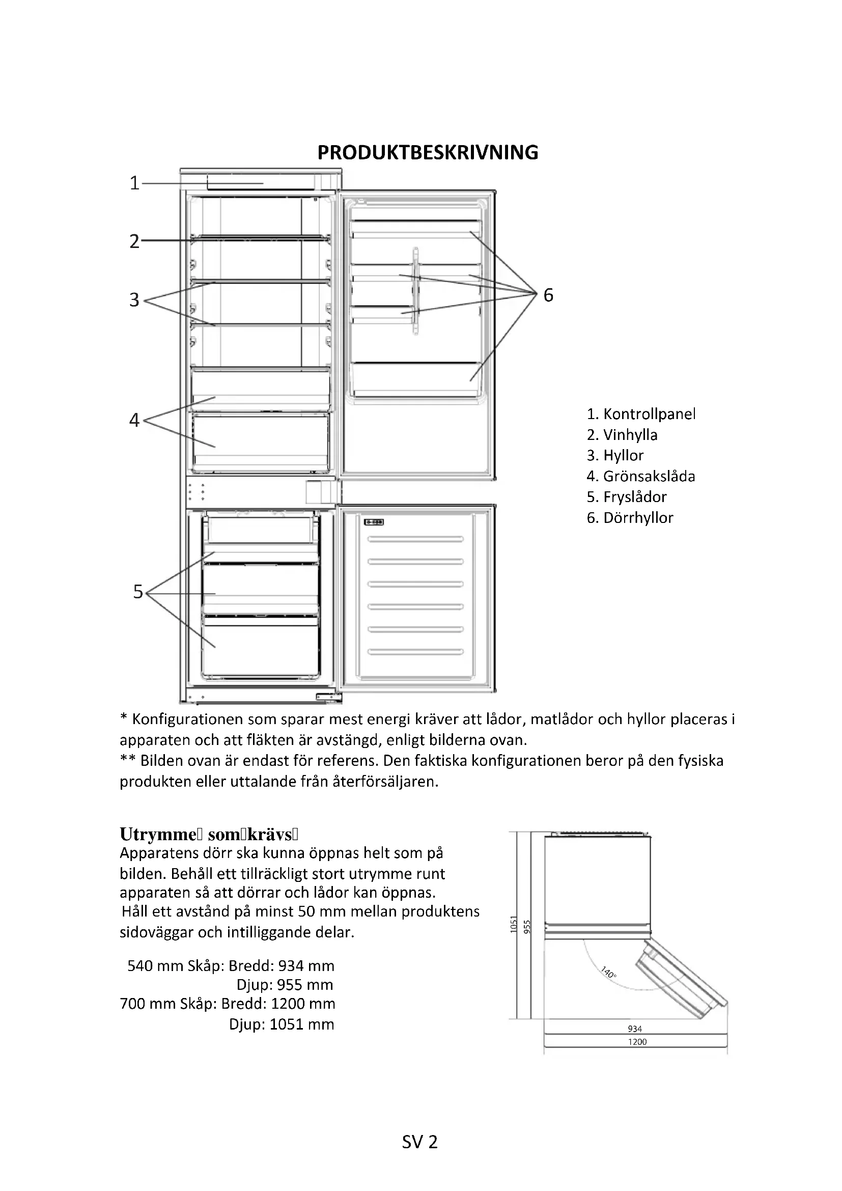 - Konfigurationen som sparar mest energi kräver att lådor, matlådor och hyllor placeras i apparaten och att fläkten är avstängd, enligt bilderna ovan.** Bilden ovan är endast för referens. Den faktiska konfigurationen beror på den fysiskaprodukten eller uttalande från återförsäljaren.Utrymme somkrävsApparatens dörr ska kunna öppnas helt som på bilden. Behåll ett tillräckligt stort utrymme runt apparaten så att dörrar och lådor kan öppnas. Håll ett avstånd på minst 50 mm mellan produktens sidoväggar och intilliggande delar.540 mm Skåp: Bredd: 934 mmDjup: 955 mm700 mm Skåp: Bredd: 1200 mmDjup: 1051 mm