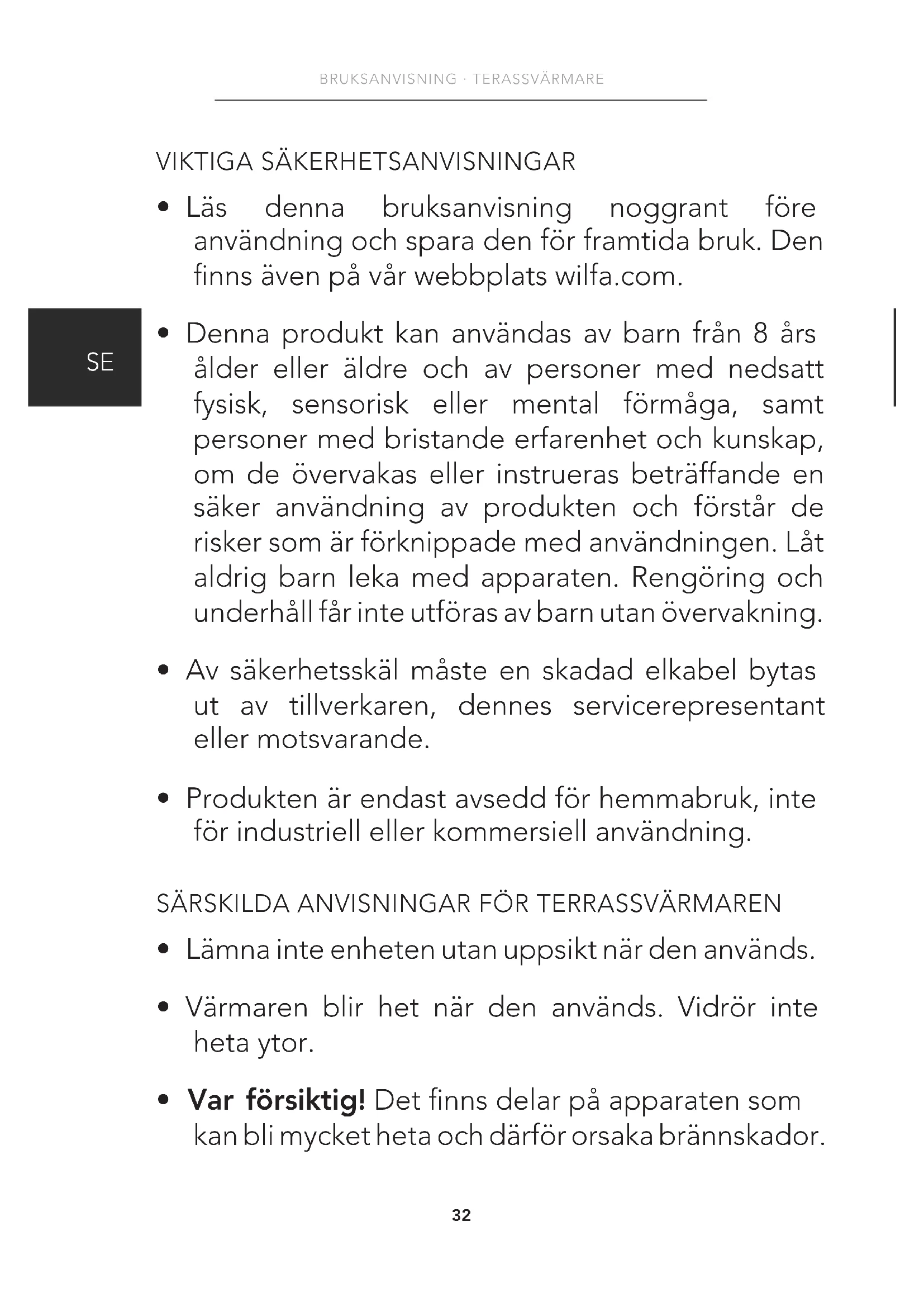 - Produkten är endast avsedd för hemmabruk, inte för industriell eller kommersiell användning. SÄRSKILDA ANVISNINGAR FÖR TERRASSVÄRMAREN