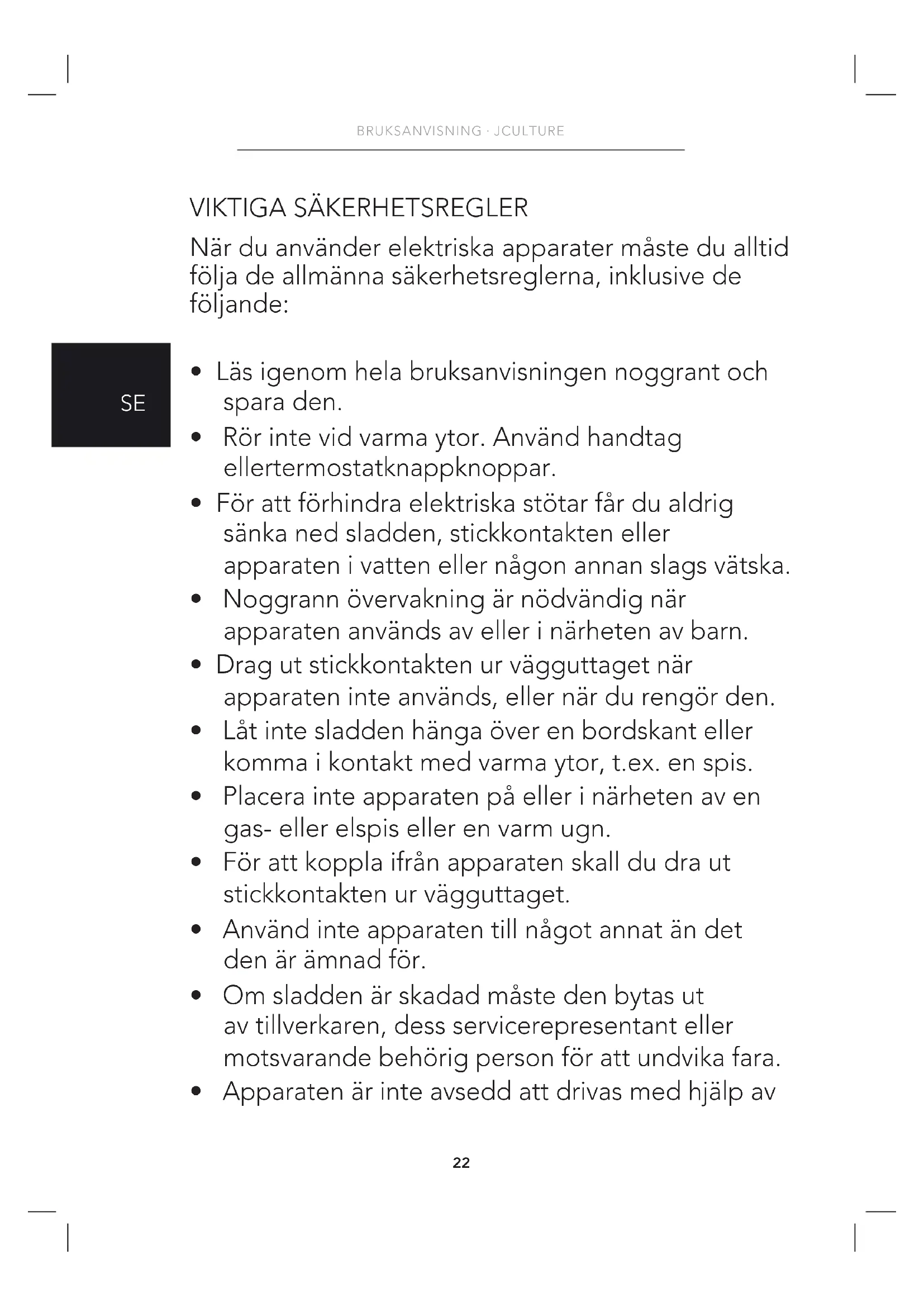 - För att förhindra elektriska stötar får du aldrig sänka ned sladden, stickkontakten eller apparaten i vatten eller någon annan slags vätska.