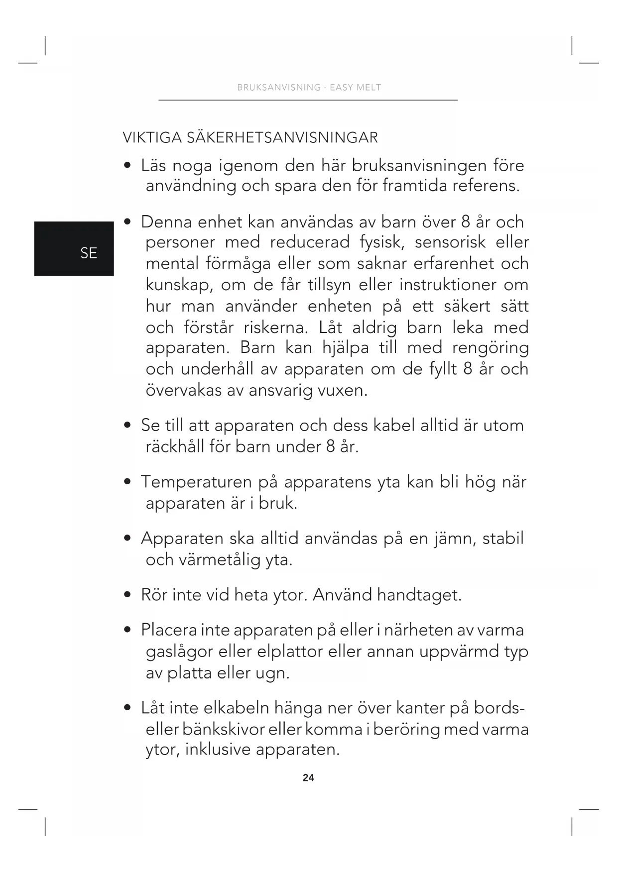 - Denna enhet kan användas av barn över 8 år och personer med reducerad fysisk, sensorisk eller mental förmåga eller som saknar erfarenhet och kunskap, om de får tillsyn eller instruktioner om hur man använder enheten på ett säkert sätt och förstår riskerna. Låt aldrig barn leka med apparaten. Barn kan hjälpa till med rengöring och underhåll av apparaten om de fyllt 8 år och övervakas av ansvarig vuxen.