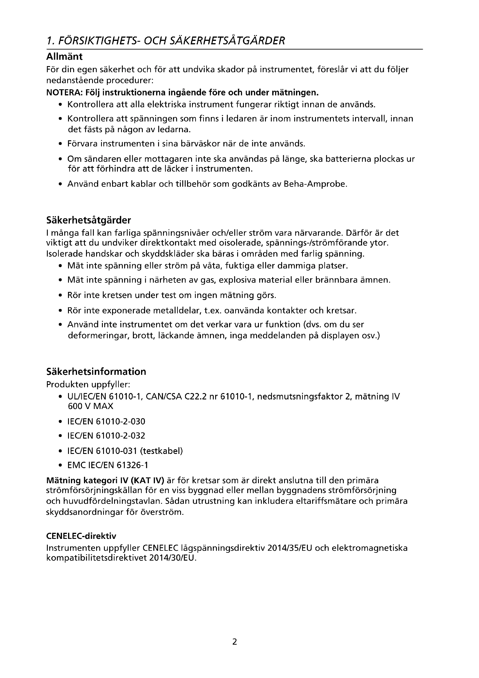 - EMC IEC/EN 61326-1 Mätning kategori IV (KAT IV) är för kretsar som är direkt anslutna till den primära strömförsörjningskällan för en viss byggnad eller mellan byggnadens strömförsörjning och huvudfördelningstavlan. Sådan utrustning kan inkludera eltariffsmätare och primära skyddsanordningar för överström. CENELEC-direktiv Instrumenten uppfyller CENELEC lågspänningsdirektiv 2014/35/EU och elektromagnetiska kompatibilitetsdirektivet 2014/30/EU.3 Varningar: Läs före användande För att undvika risk för elektrisk chock och personskada: