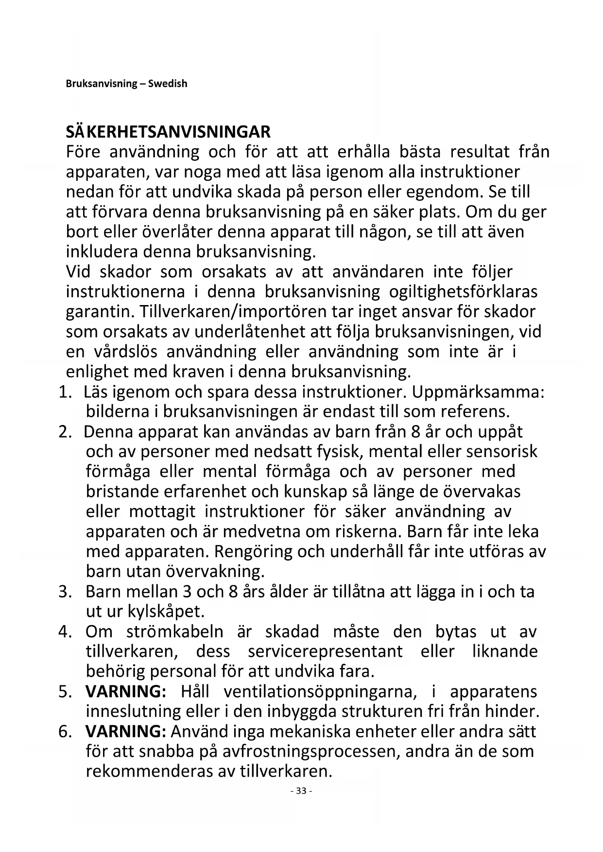 hantering, service, byte av lampa (om tillämpligt), rengöring och avyttring av apparaten, se nedanstående avsnitt i bruksanvisningen. VARNING: Risk för brand/Brandfarligt material Kylkretsen i denna enhet innehåller kylmedlet Isobutan (R600a), en naturlig gas som är brännbar och med hög- 36 - miljökompatibilitet. Se till att inga delar av kylkretsen skadas under transporten och installationen av apparaten. Om kylkretsen skadats: undvik alla öppna lågor och gnistkällor; dra ur kontakten; vädra rummet där apparaten är installerad och kontakta en auktoriserad tekniker.- 37 - CFR-126353 SE