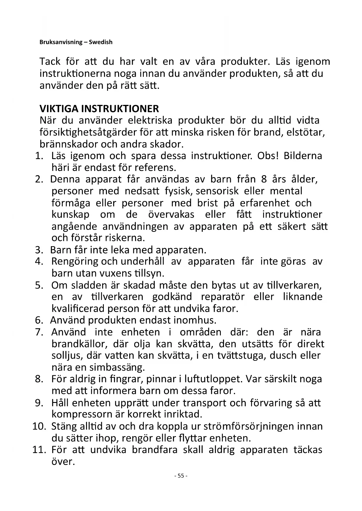 8. För aldrig in fingrar, pinnar i luftutloppet. Var särskilt noga