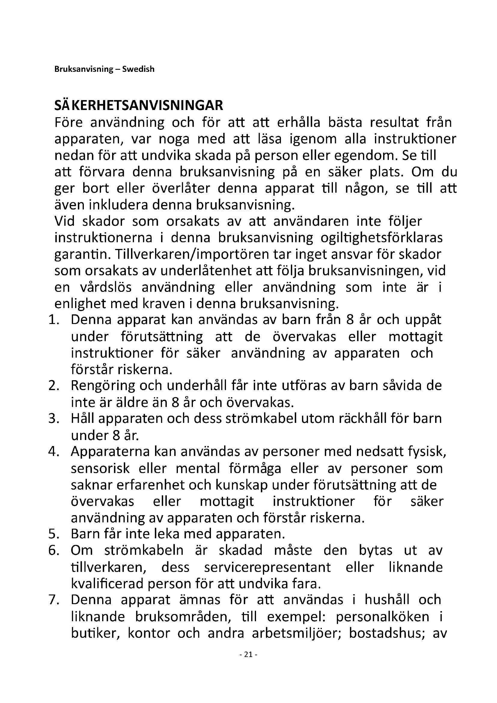 Färe användning och für att att erhälla)bastaresultat frän apparaten, var noga med att lasaigenom alla instruktioner nedan for att undvika skada på person eller egendom. Se till att Förvaraenna bruksanvisning på en saker plats. Om du ger bort ell er overlaterenna apparat till nagon, se till att även inkluderaenna bruksanvisning.