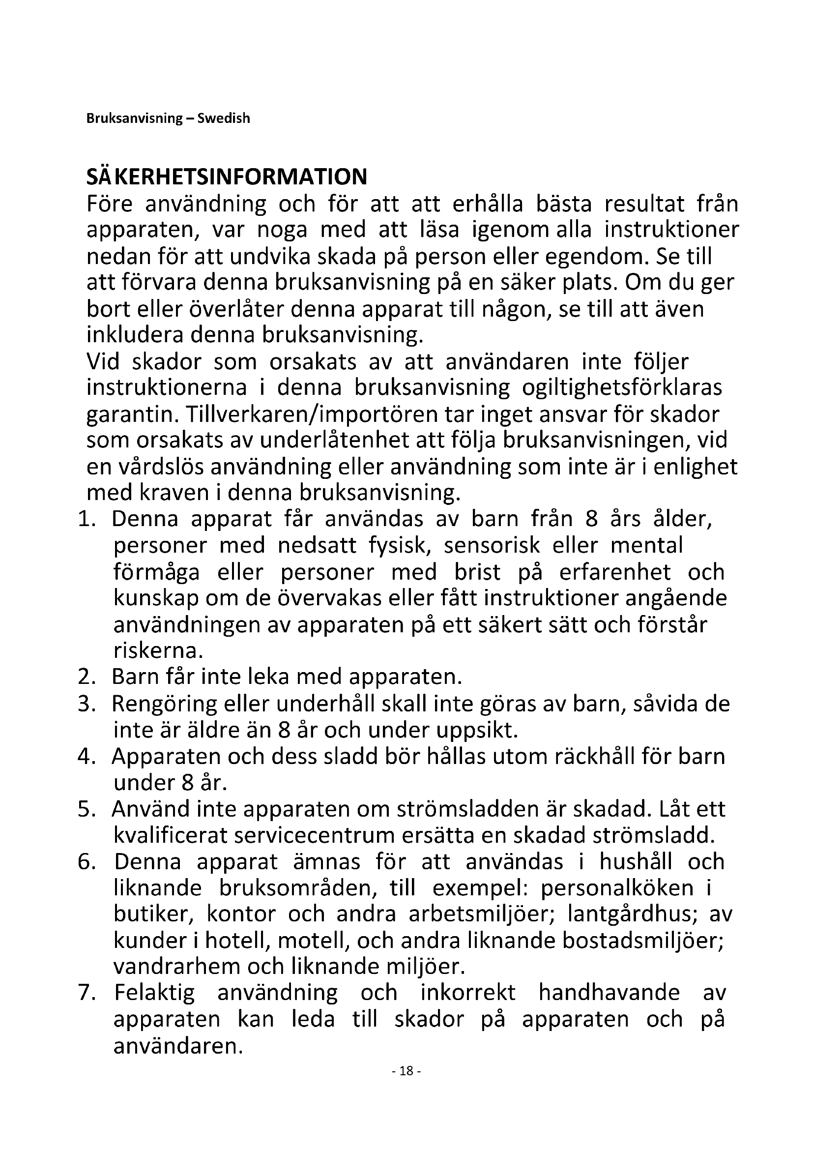8. Apparaten är inte lämplig för kommersiellt bruk och ska