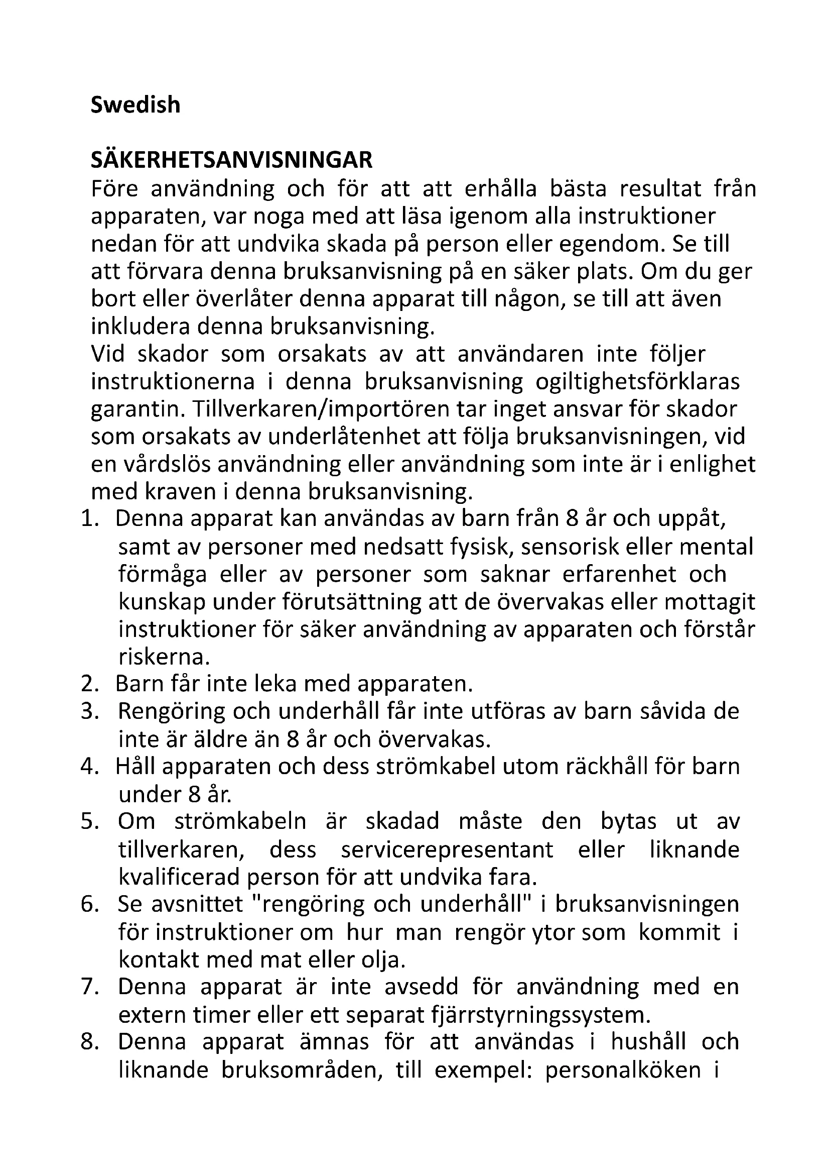 AVERTISSEMENT !! Ne touchez pas les surfaces de l’appareil pendant l’utilisation. La température des surfaces accessibles peut être élevée quand l'appareil est en fonctionnement.Swedish SÄKERHETSANVISNINGAR Före användning och för att att erhålla bästa resultat från apparaten, var noga med att läsa igenom alla instruktioner nedan för att undvika skada på person eller egendom. Se till att förvara denna bruksanvisning på en säker plats. Om du ger bort eller överlåter denna apparat till någon, se till att även inkludera denna bruksanvisning. Vid skador som orsakats av att användaren inte följer instruktionerna i denna bruksanvisning ogiltighetsförklaras garantin. Tillverkaren/importören tar inget ansvar för skador som orsakats av underlåtenhet att följa bruksanvisningen, vid en vårdslös användning eller användning som inte är i enlighet med kraven i denna bruksanvisning.