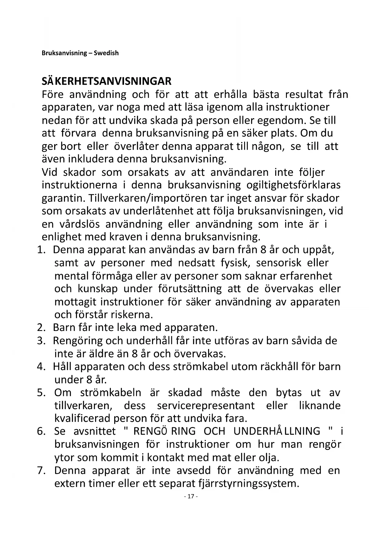 1. Denna apparat kan användas av barn från 8 år och uppåt,