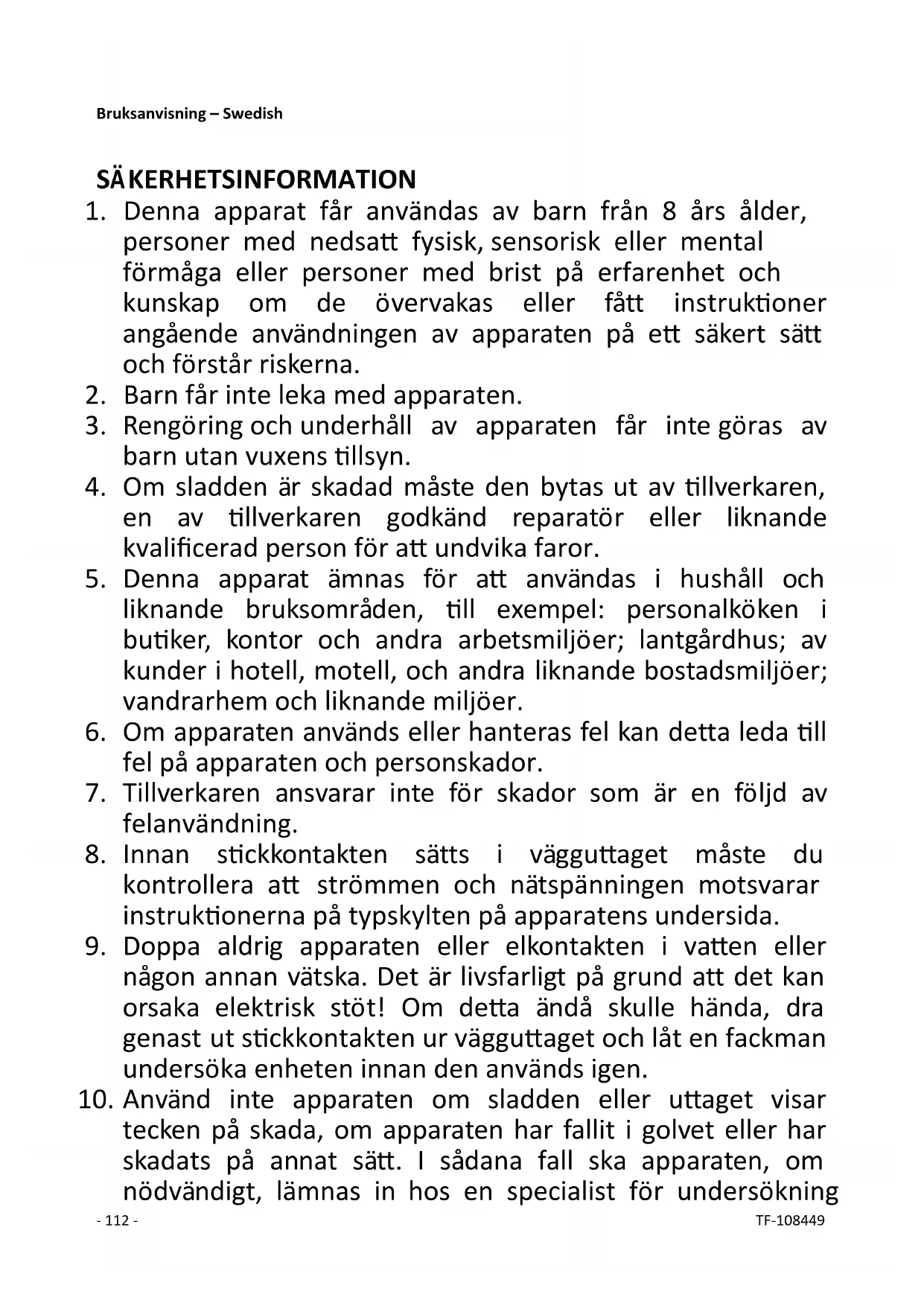 tecken på skada, om apparaten har fallit i golvet eller har skadats på annat sätt. I sådana fall ska apparaten, om nödvändigt, lämnas in hos en specialist för undersökning- 113 - TF-108449 och reparation.