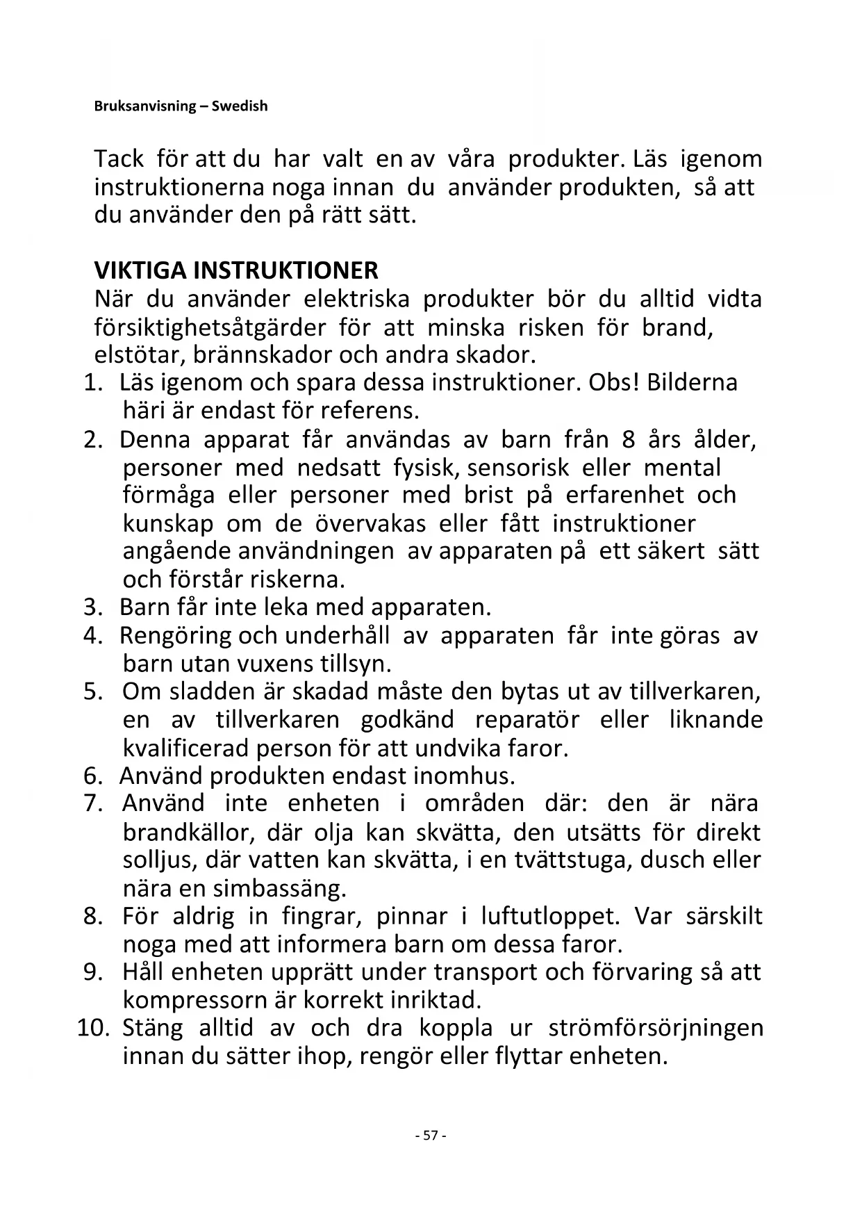 - Rengöring och unterhäll av apparaten fär inte göras av barnutan vuxens tillsyn.