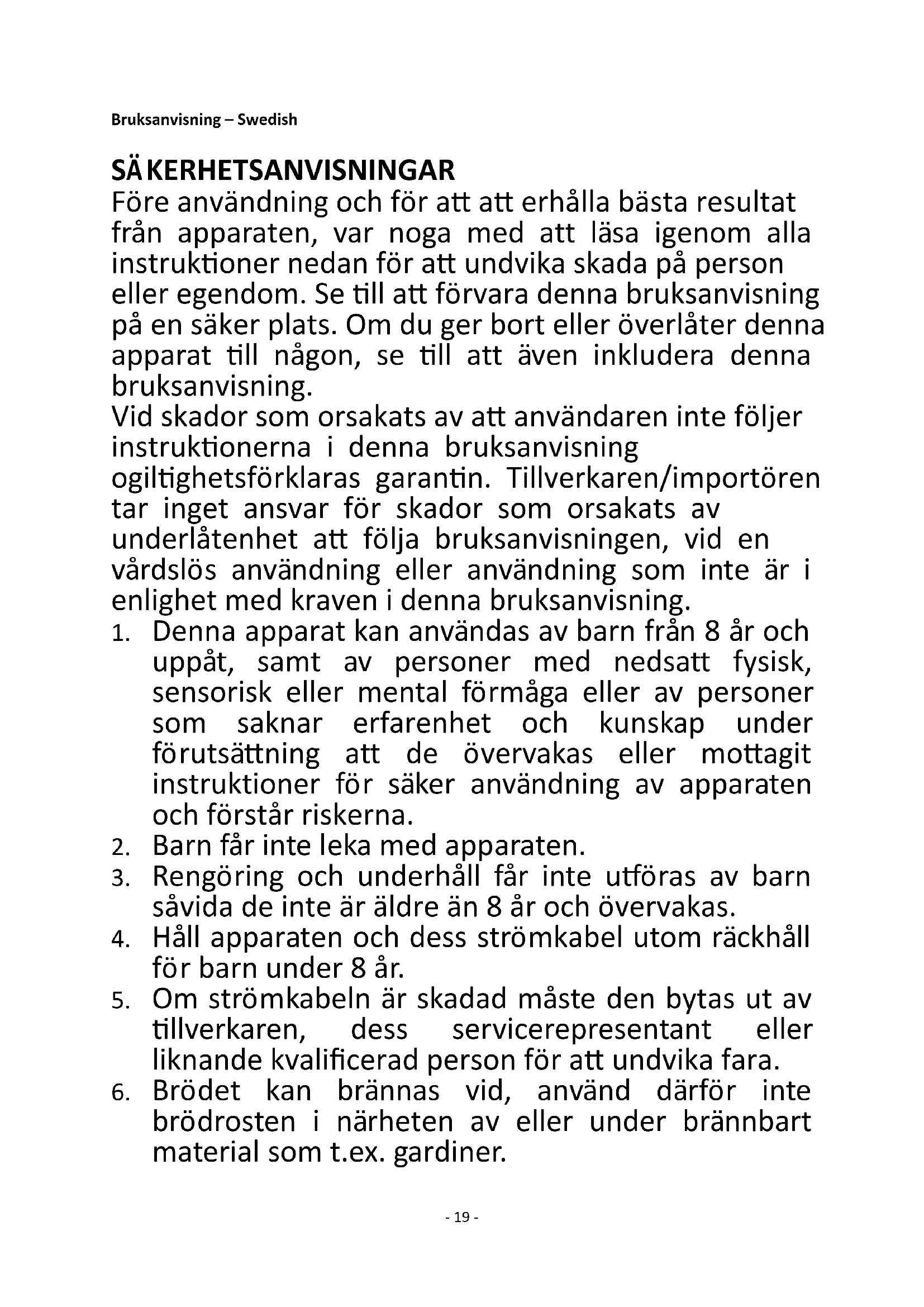 brödrosten i närheten av eller under brännbart material som t.ex. gardiner.- 20 -