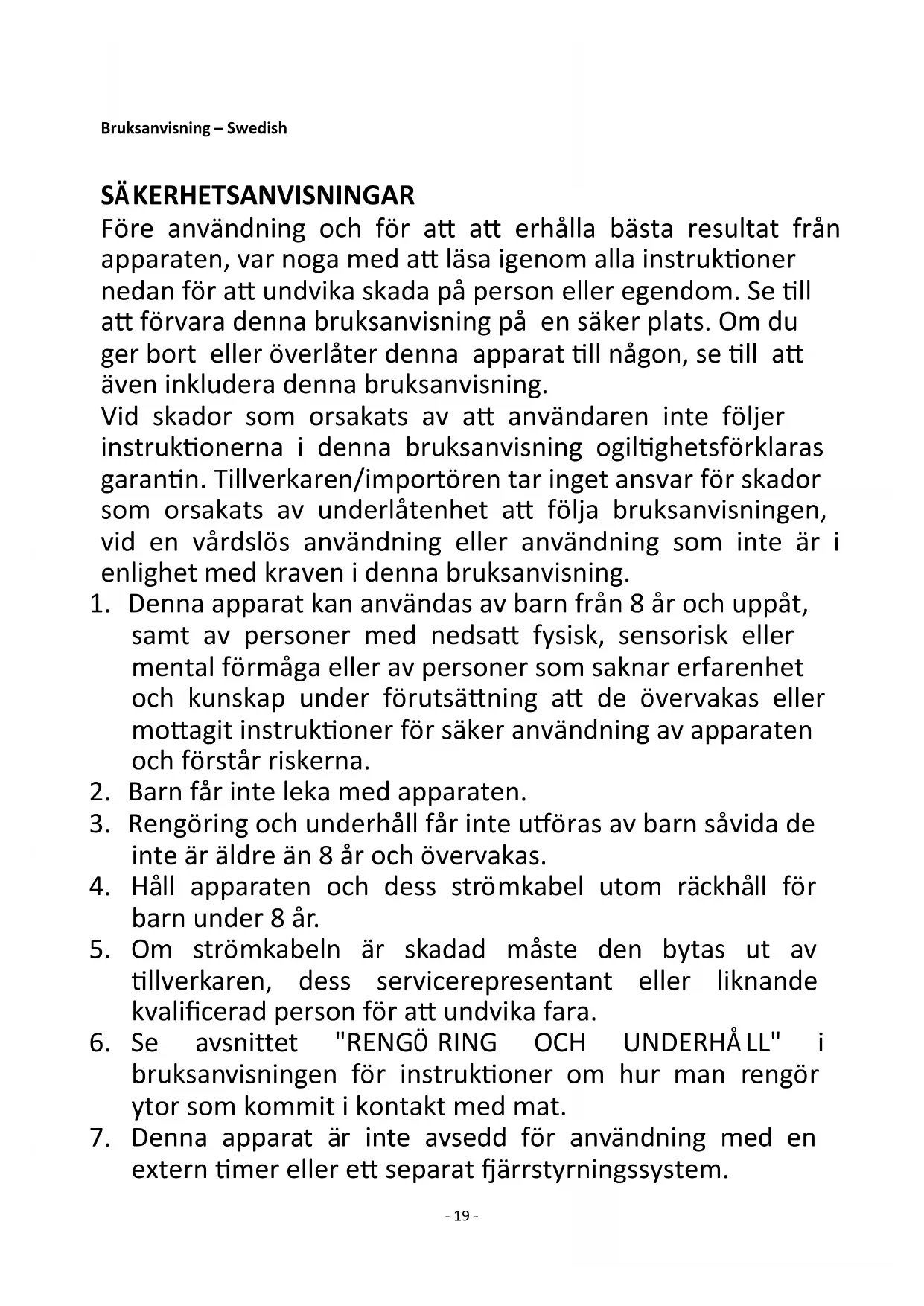 Recyclage – Directive européenne 2012/19/EU Ce symbole indique que le produit ne doit pas être jeté avec les ordures ménagères. Pour limiter les risques pour l’environnement et la santé entraînés par le rejet non contrôlé des déchets, recyclez ce dernier pour promouvoir une réutilisation responsable de ses matériaux. Pour recycler votre produit, utilisez les réseaux de collecte de votre région ou prenez contact avec le revendeur du produit. Ce dernier pourra vous aider à le recycler. Emerio Deutschland GmbH (no service address) Lerchenweg 3 40789 Monheim am Rhein Deutschland Service à la clientèle: T: +49 (0) 3222 1097 600 E: info.de@emerio.eu- 19 - Bruksanvisning – Swedish SÄKERHETSANVISNINGAR Före användning och för att att erhålla bästa resultat från apparaten, var noga med att läsa igenom alla instruktioner nedan för att undvika skada på person eller egendom. Se till att förvara denna bruksanvisning på en säker plats. Om du ger bort eller överlåter denna apparat till någon, se till att även inkludera denna bruksanvisning. Vid skador som orsakats av att användaren inte följer instruktionerna i denna bruksanvisning ogiltighetsförklaras garantin. Tillverkaren/importören tar inget ansvar för skador som orsakats av underlåtenhet att följa bruksanvisningen, vid en vårdslös användning eller användning som inte är i enlighet med kraven i denna bruksanvisning.