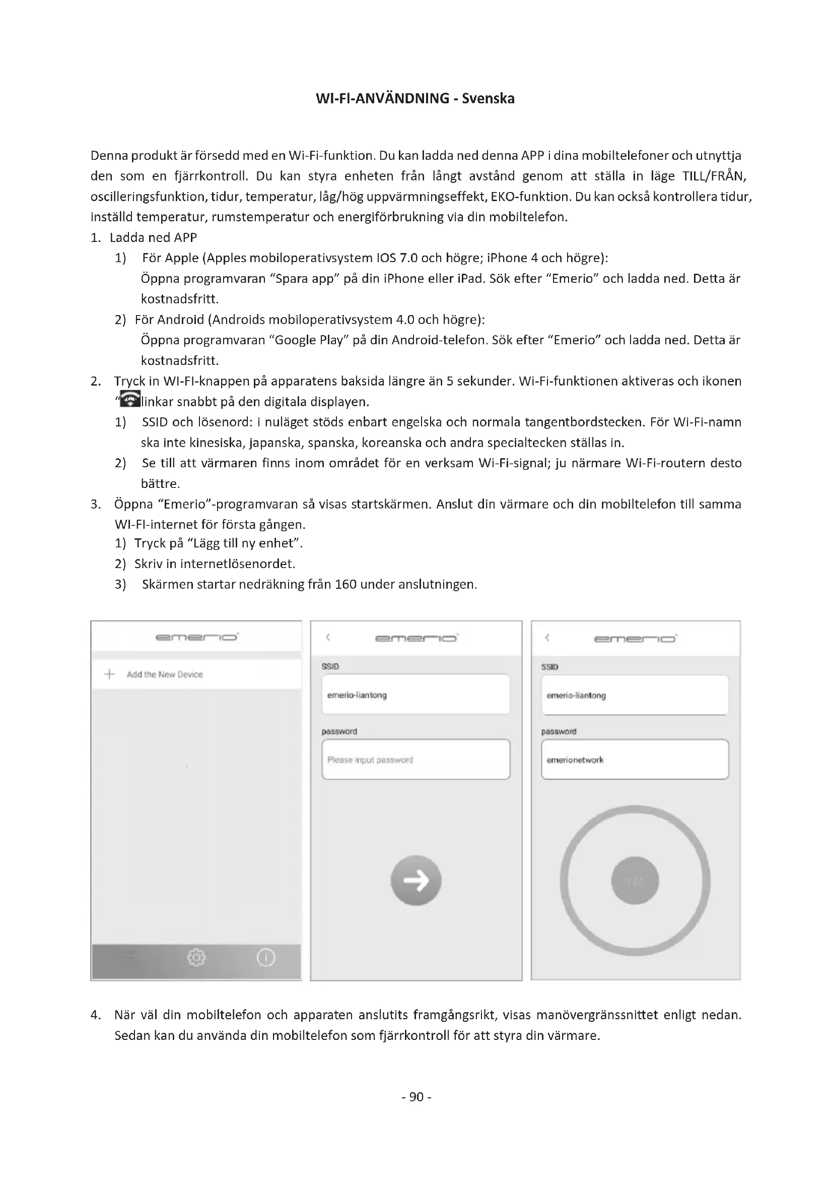 Datanätverk Under förhållanden utan Wi-Fi-tillgång, går det ändå att ansluta mobiltelefonen till värmaren. Stäng först av Wi- Fi-inställningen och öppna sedan datanätverket (försök styra produkten via 3G-/4G-nätverk). Efter ungefär 30 s, kan det söka efter enheten. Mot bakgrund av instabiliteten hos 3G/4G, kan det vara en fördröjning om 1-2 s, vilket är normalt. Datanätverk ska användas under förutsättning att mobiltelefonen tidigare har anslutits till värmaren via Wi-Fi.- 94 - WI-FI KULLANIMI - Türkçe Bu ürün Wi-Fi fonksiyonu ile donatılmıştır. Cep telefonlarınıza uygulamayı indirebilir ve uzaktan kumanda gibi kullanabilirsiniz. Üniteyi uzaktan gücü açma/kapatma, salınım fonksiyonu, zamanlayıcı, sıcaklık, düşük ısıtma gücü/yüksek ısıtma gücü, ECO fonksiyonunu ayarlayarak kontrol edebilirsiniz. Ayrıca cep telefonunuzda zamanlayıcıyı, ayarlanan sıcaklığı, oda sıcaklığını ve enerji tüketimini kontrol edebilirsiniz.