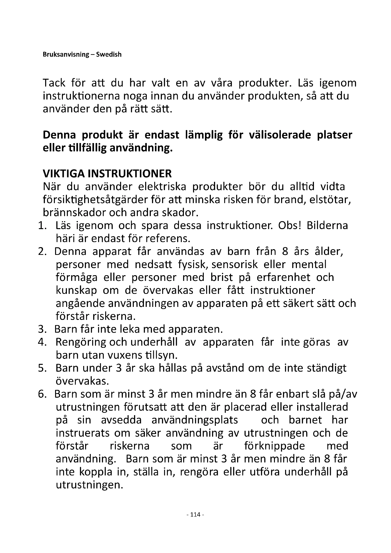 sjunker slår den på uppvärmningen automatiskt. OBS: Apparaten har en brytare för swing-funktion. Tryck på den för oscillation. SÄKERHETSSYSTEM Produkten har ett inbyggt säkerhetssystem som gör att den automatiskt stängs av vid överhettning. Om produkten blir överhettad: dra ut stickkontakten ur eluttaget, tryck på knapparna för att stänga av enheten och låt den svalna under minst 10 minuter. Sätt i stickkontakten i vägguttaget igen och sätt på värmefläkten. Den här värmeapparaten är utrustad med säkerhetsfunktion vid tippning. Om apparaten lutar för mycket eller tippar så kommer den automatiskt att slås av tack vare denna säkerhetsfunktion. Av säkerhetsskäl kommer enheten att slås av automatiskt om den placeras på ostabila eller ojämna underlag eller om den lutas för mycket åt ena eller andra sidan. UNDERHÅLL Värmefläkten behöver endast regelbunden rengöring utvändigt. Stäng av enheten innan du rengör den. Dra ut stickkontakten ur vägguttaget och vänta tills värmefläkten har svalnat. Använd en fuktig trasa för att torka av höljet. Använd inga rengöringsmedel, polermedel för rengöring eller kemikalier (alkohol, bensin el. dyl.). TEKNISKA DATA Driftsspänning: 220-240V ~ 50/60Hz Strömförbrukning: 1800-2000W Återvinning - EU-direktiv 2012/19/EU Denna markering indikerar att produkten inte får kastas tillsammans med övrigt hushållsavfall. För att förhindra eventuell miljöförstöring och eventuella hälsorisker på grund av icke kontrollerad avyttring ska den avyttras med ansvar för att materialet ska kunna återanvändas på ett hållbart sätt. Returnera den använda enheten enligt retur- och insamlingssystem eller kontakta återförsäljaren som sålt produkten. Återförsäljaren kan ombesörja att produkten återvinns på ett miljömässigt säkert sätt.