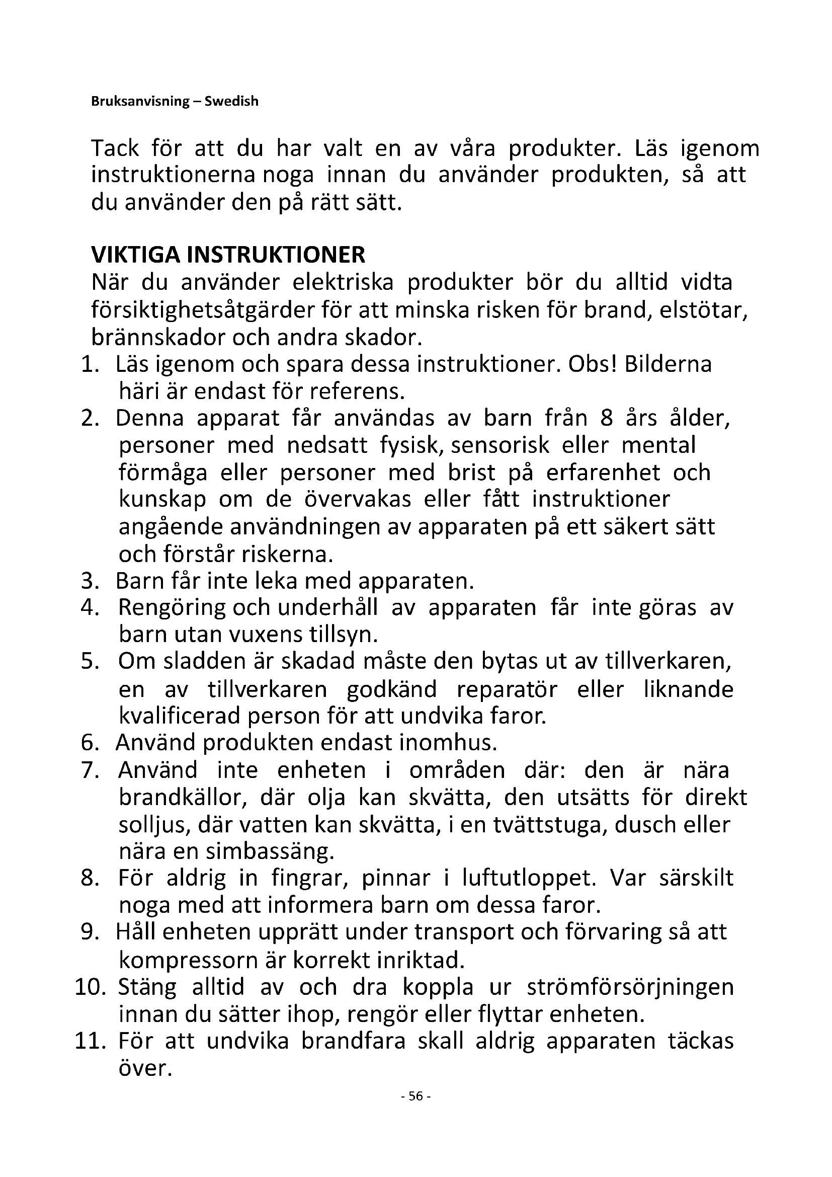 11. För att undvika brandfara skall aldrig apparaten täckas