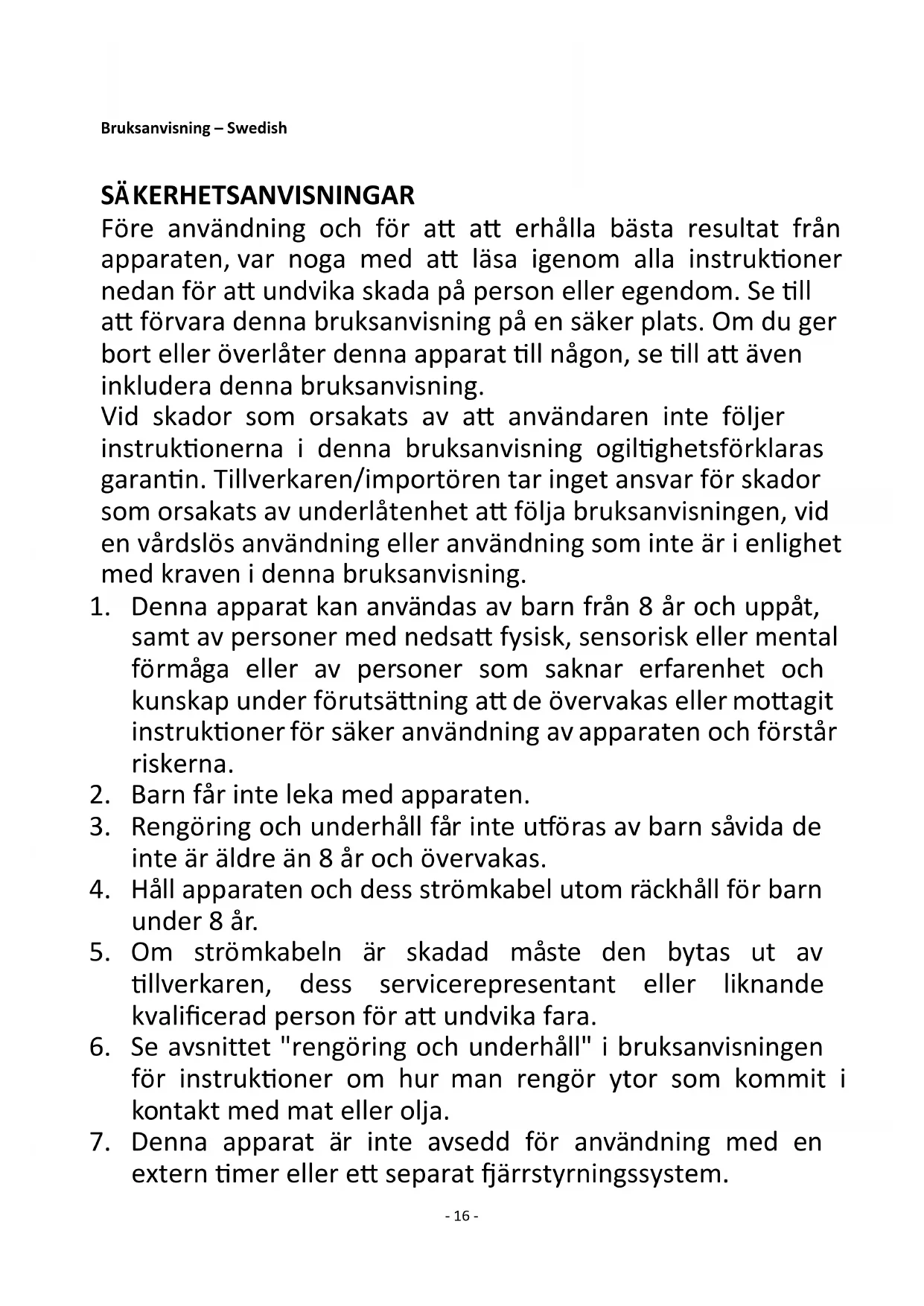 Lerchenweg 3 40789 Monheim am Rhein Deutschland- 16 - Bruksanvisning – Swedish SÄKERHETSANVISNINGAR Före användning och för att att erhålla bästa resultat från apparaten, var noga med att läsa igenom alla instruktioner nedan för att undvika skada på person eller egendom. Se till att förvara denna bruksanvisning på en säker plats. Om du ger bort eller överlåter denna apparat till någon, se till att även inkludera denna bruksanvisning. Vid skador som orsakats av att användaren inte följer instruktionerna i denna bruksanvisning ogiltighetsförklaras garantin. Tillverkaren/importören tar inget ansvar för skador som orsakats av underlåtenhet att följa bruksanvisningen, vid en vårdslös användning eller användning som inte är i enlighet med kraven i denna bruksanvisning.