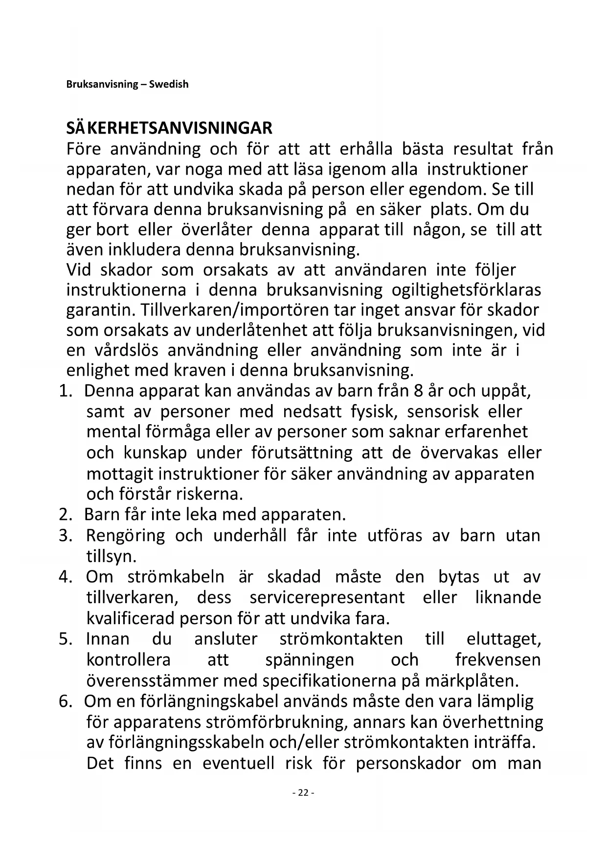 för apparatens strömförbrukning, annars kan överhettning av förlängningsskabeln och/eller strömkontakten inträffa. Det finns en eventuell risk för personskador om man- 23 - snubblar över förlängningskabeln. Var noga med att undvika att skapa farliga situationer.