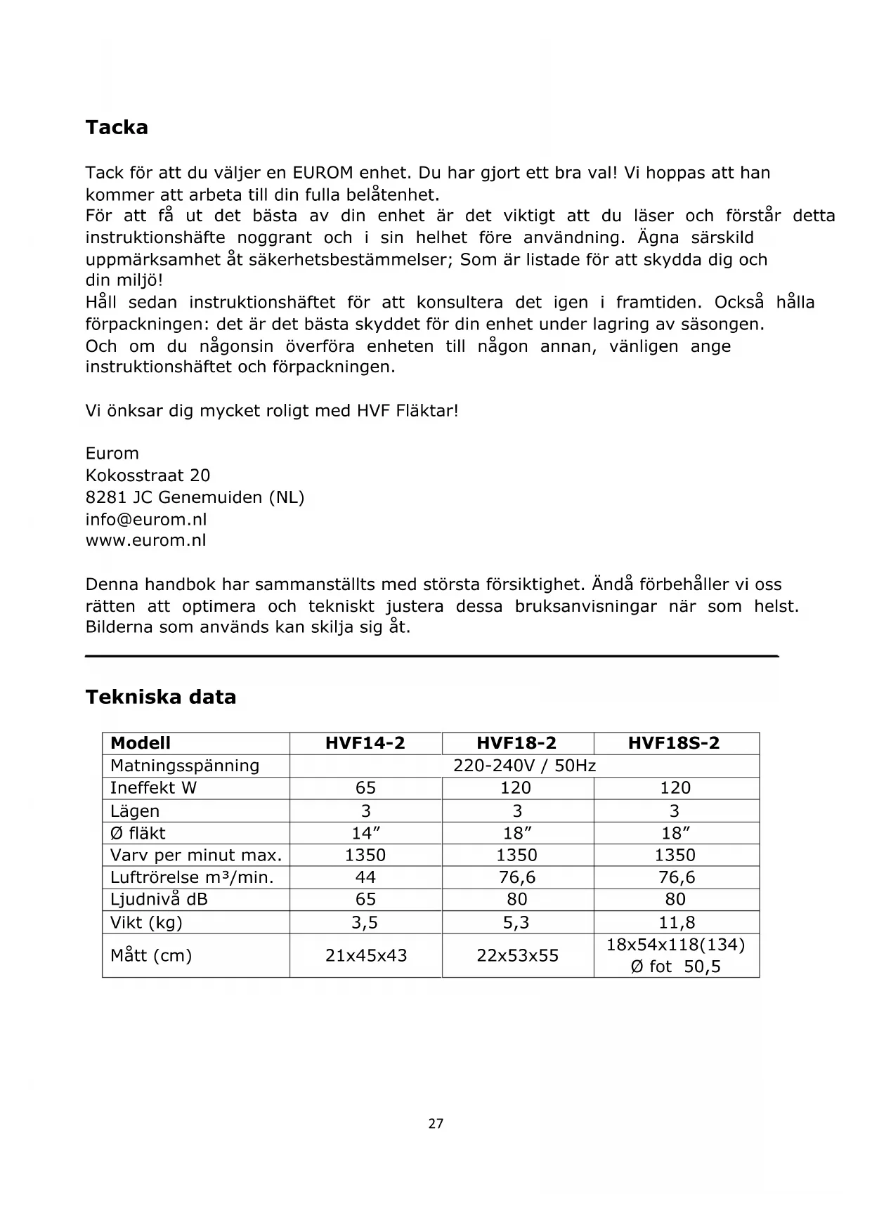 Genemuiden, 19-08-2020 W.J. Bakker, alg. dir.27 Tacka Tack för att du väljer en EUROM enhet. Du har gjort ett bra val! Vi hoppas att han kommer att arbeta till din fulla belåtenhet. För att få ut det bästa av din enhet är det viktigt att du läser och förstår detta instruktionshäfte noggrant och i sin helhet före användning. Ägna särskild uppmärksamhet åt säkerhetsbestämmelser; Som är listade för att skydda dig och din miljö! Håll sedan instruktionshäftet för att konsultera det igen i framtiden. Också hålla förpackningen: det är det bästa skyddet för din enhet under lagring av säsongen. Och om du någonsin överföra enheten till någon annan, vänligen ange instruktionshäftet och förpackningen. Vi önksar dig mycket roligt med HVF Fläktar! Eurom Kokosstraat 20 8281 JC Genemuiden (NL) info@eurom.nl www.eurom.nl Denna handbok har sammanställts med största försiktighet. Ändå förbehåller vi oss rätten att optimera och tekniskt justera dessa bruksanvisningar när som helst. Bilderna som används kan skilja sig åt.