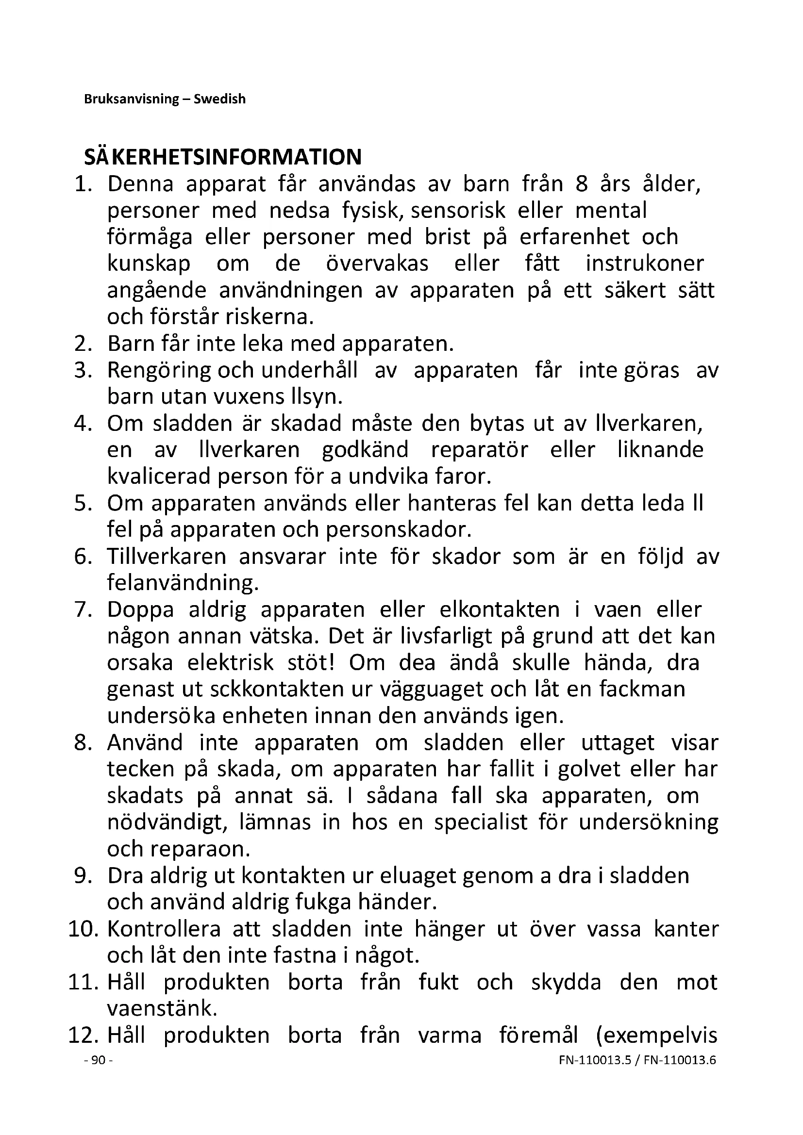 12. Håll produkten borta från varma föremål (exempelvis- 91 - FN-110013.5 / FN-110013.6
