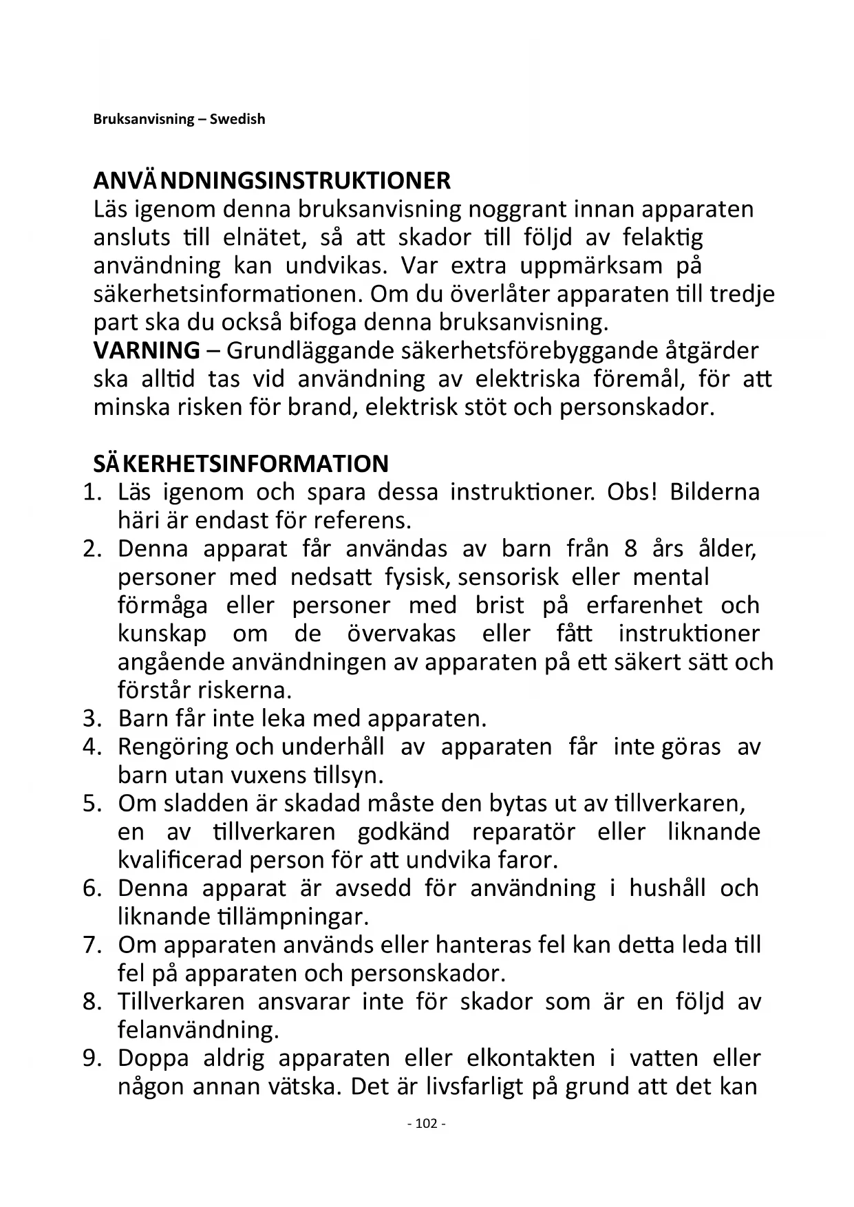 5. Om sladden är skadad måste den bytas ut av tillverkaren,
