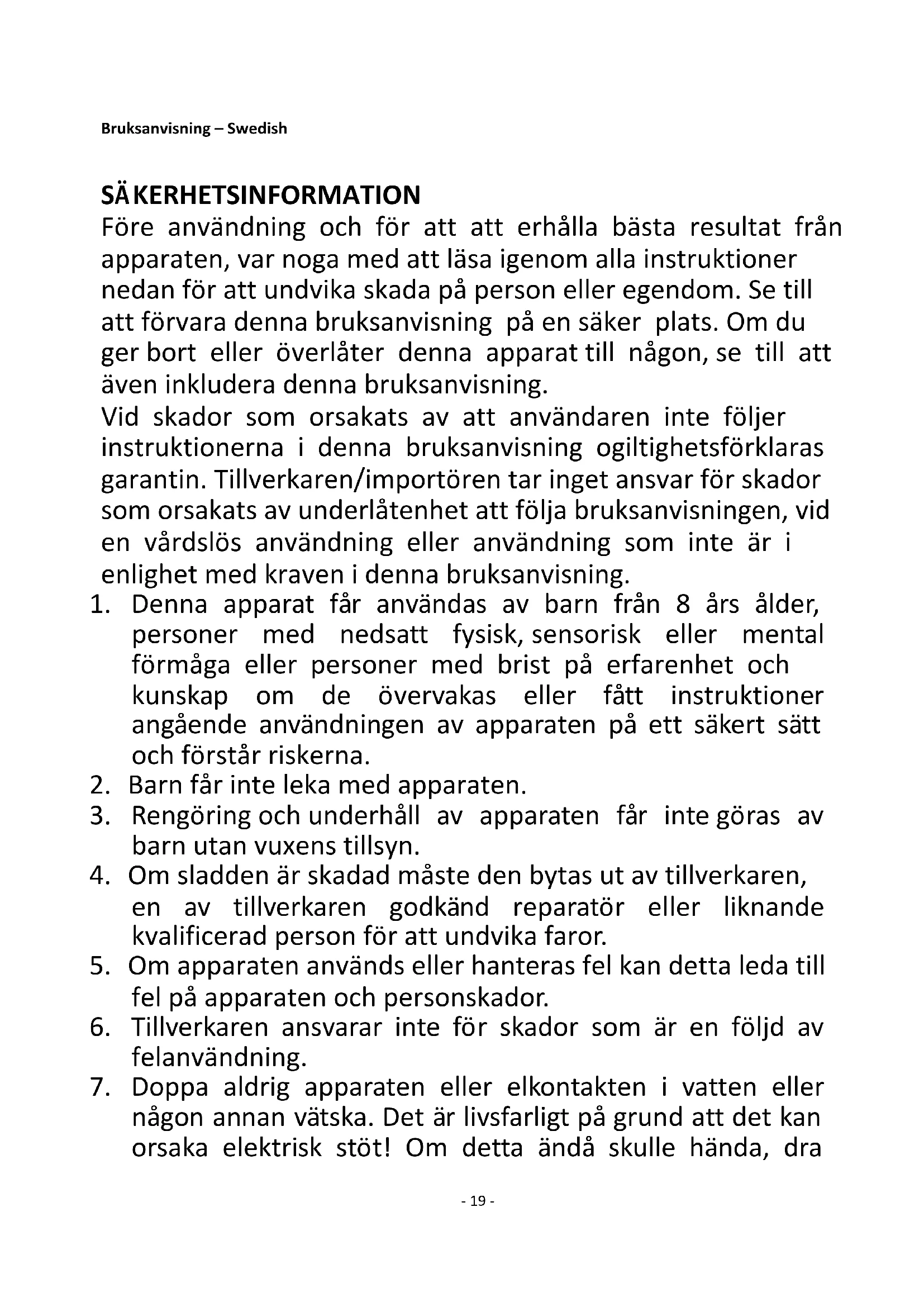 En ce qui concerne les informations pour les consommateurs sur comment installer, utiliser et entretenir le produit, les informations DEEE, consultez le manuel d’instruction fourni avec l’emballage.- 19 - Bruksanvisning – Swedish SÄKERHETSINFORMATION Före användning och för att att erhålla bästa resultat från apparaten, var noga med att läsa igenom alla instruktioner nedan för att undvika skada på person eller egendom. Se till att förvara denna bruksanvisning på en säker plats. Om du ger bort eller överlåter denna apparat till någon, se till att även inkludera denna bruksanvisning. Vid skador som orsakats av att användaren inte följer instruktionerna i denna bruksanvisning ogiltighetsförklaras garantin. Tillverkaren/importören tar inget ansvar för skador som orsakats av underlåtenhet att följa bruksanvisningen, vid en vårdslös användning eller användning som inte är i enlighet med kraven i denna bruksanvisning.
