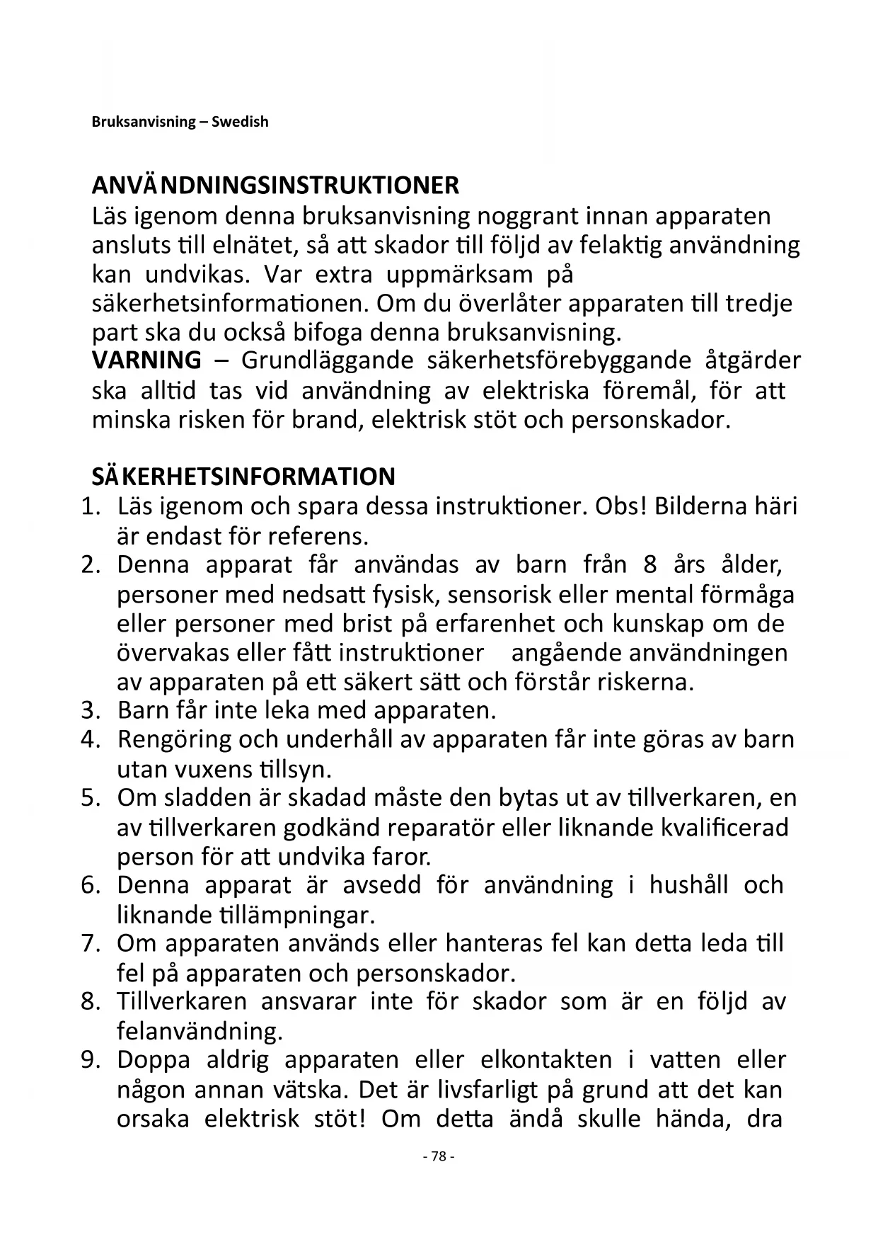 22. Apparaten måste monteras fullständigt före användning.