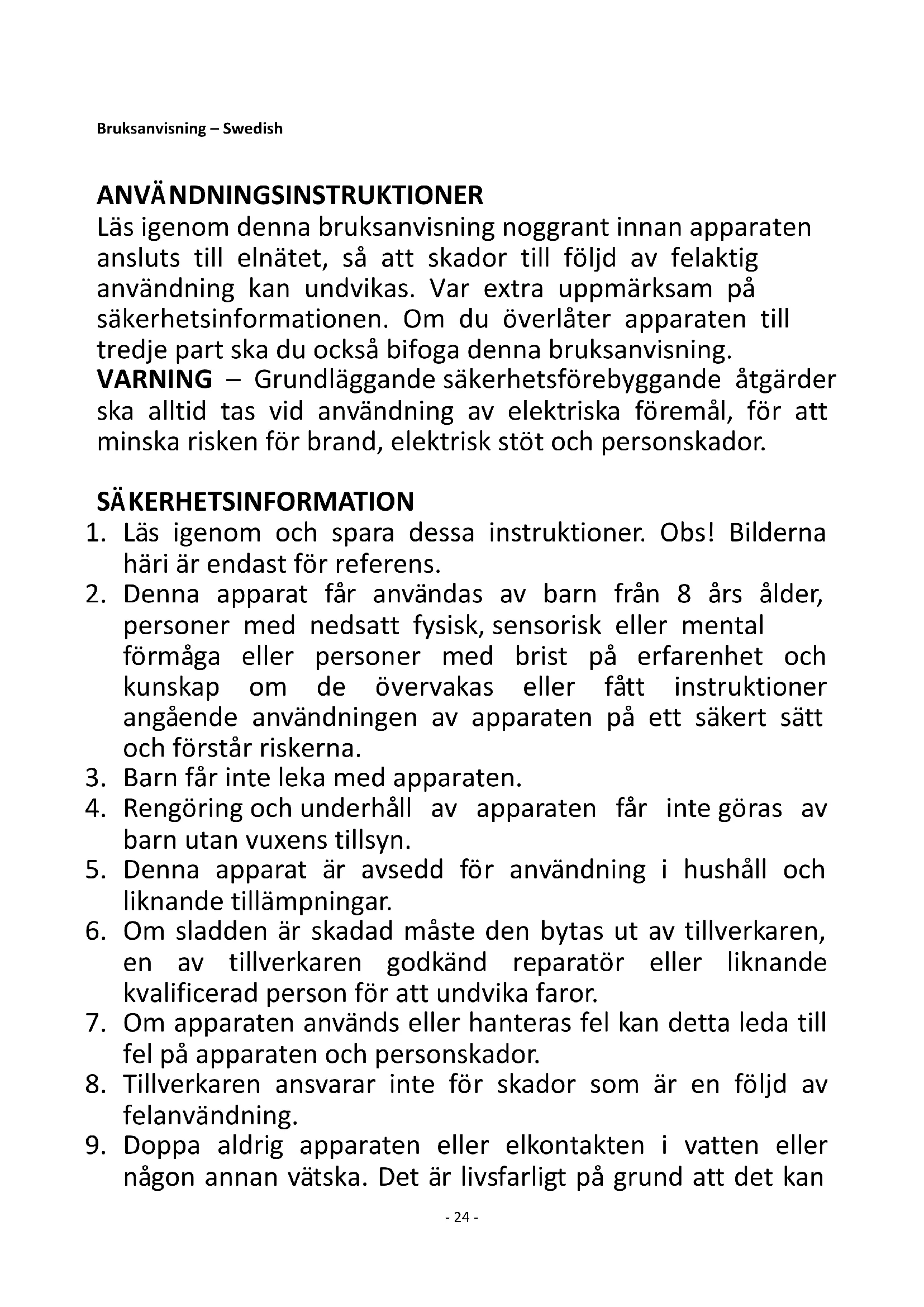 En ce qui concerne les informations pour les consommateurs sur comment installer, utiliser et entretenir le produit, les informations DEEE, consultez le manuel d’instruction fourni avec l’emballage.- 24 - Bruksanvisning – Swedish ANVÄNDNINGSINSTRUKTIONER Läs igenom denna bruksanvisning noggrant innan apparaten ansluts till elnätet, så att skador till följd av felaktig användning kan undvikas. Var extra uppmärksam på säkerhetsinformationen. Om du överlåter apparaten till tredje part ska du också bifoga denna bruksanvisning. VARNING – Grundläggande säkerhetsförebyggande åtgärder ska alltid tas vid användning av elektriska föremål, för att minska risken för brand, elektrisk stöt och personskador. SÄKERHETSINFORMATION