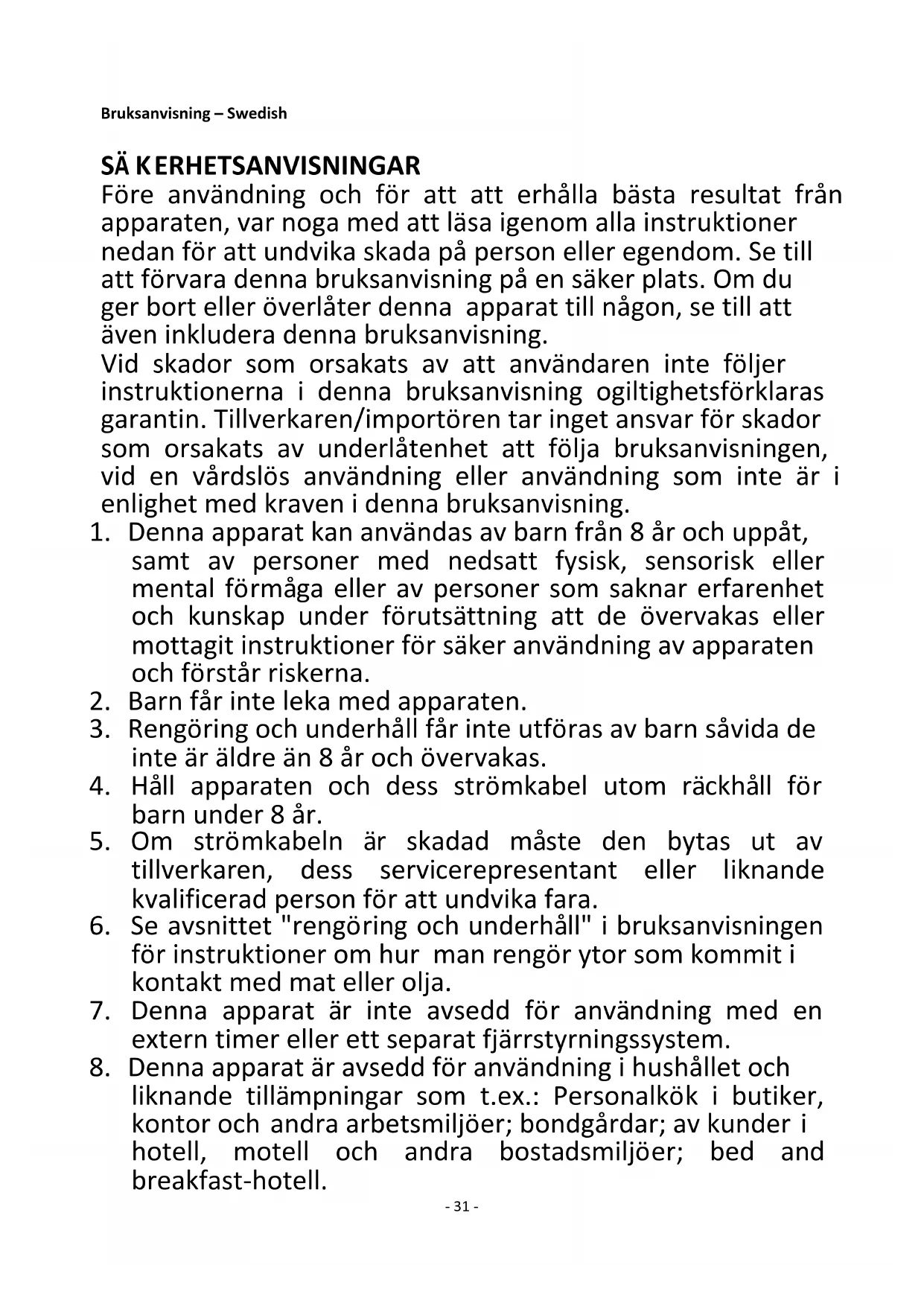 8. Denna apparat är avsedd för användning i hushållet och