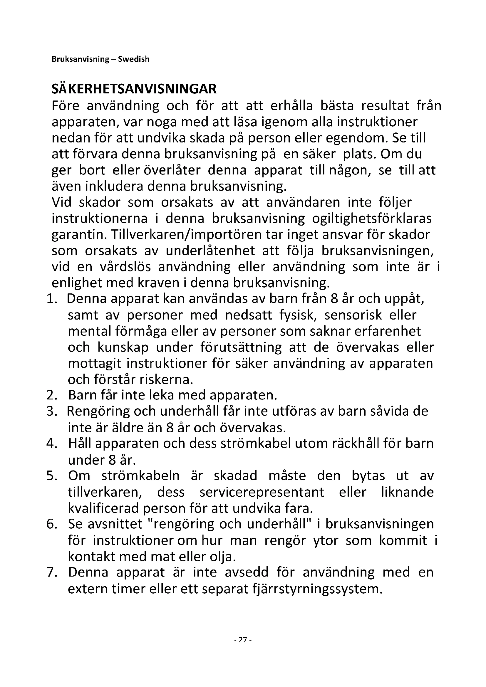 19. Använd inte apparaten för något annat ändamål än den är