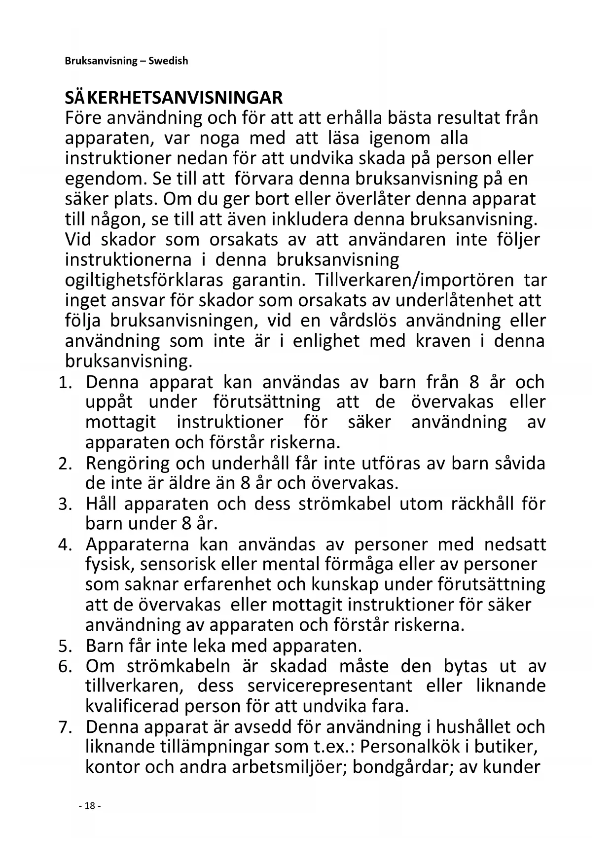 7. Denna apparat är avsedd för användning i hushållet och