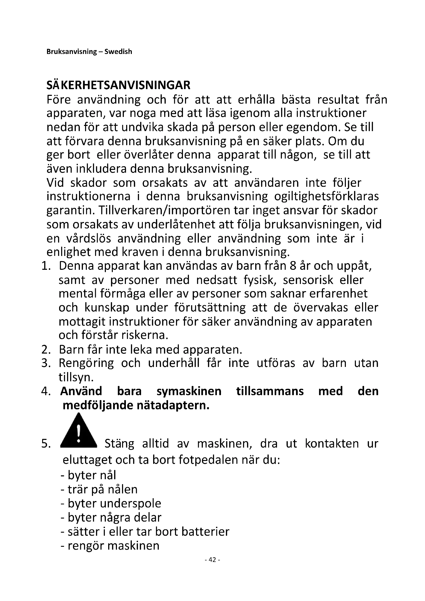 eluttaget och ta bort fotpedalen när du: - byter nål - trär på nålen - byter underspole - byter några delar - sätter i eller tar bort batterier - rengör maskinen- 43 - - efter varje användning