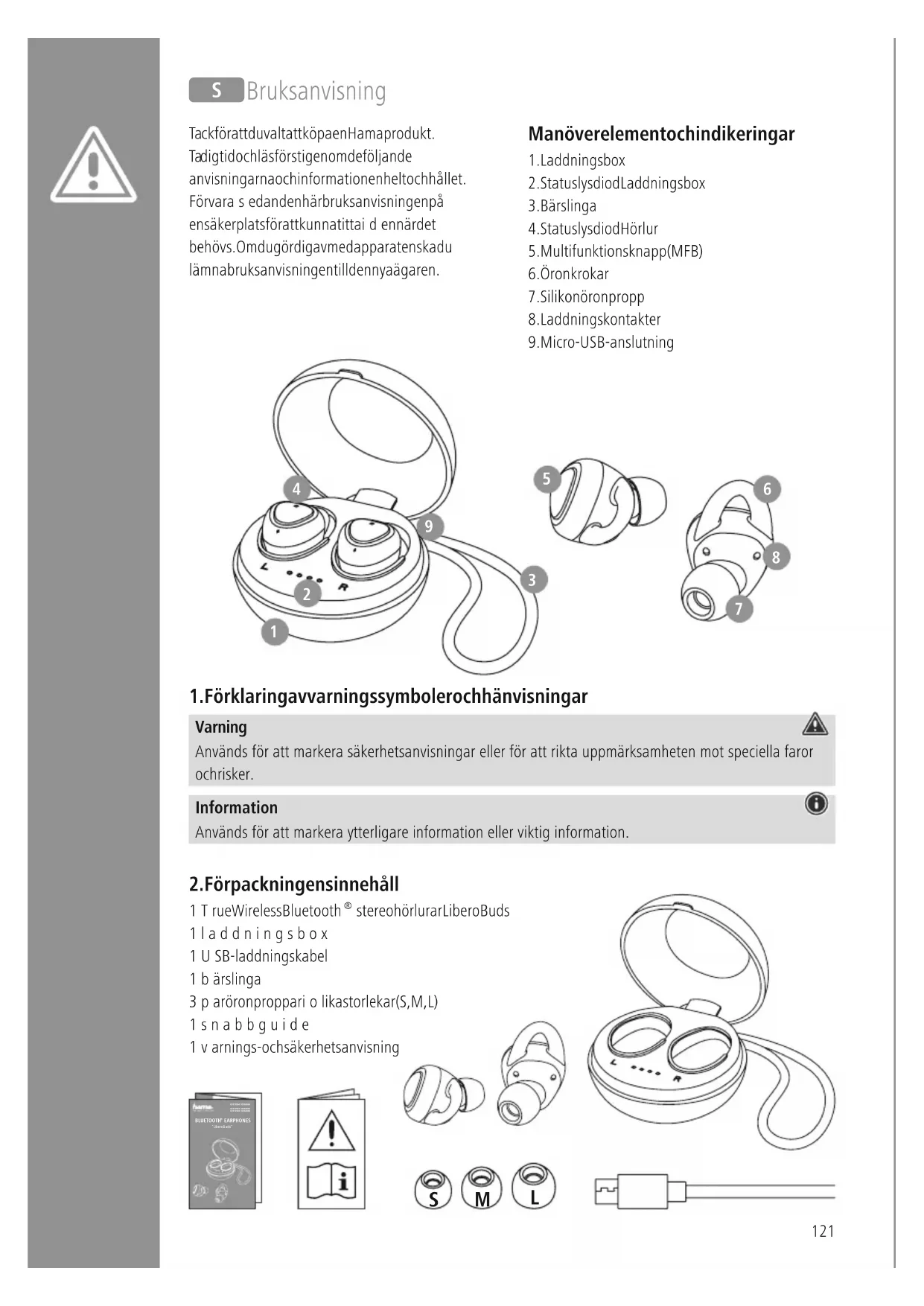 AHama GmbH &CoKGdeclarapor esta via que oequipamento de rádio do tipo [00177064, 00177065, 00177066, 00184064, 00184065, 00184066] está em conformidade com a Diretiva 2014/53/UE Otexto integral da declaração de conformidade está disponível no seguinte endereço de Internet: wwwhamacom->00177064, 00177065, 00177066, 00184064, 00184065, 00184066-> Downloads Banda(s) de frequências 2402MHz –2480 MHz Potência máxima transmitida 5,32mW EIRP121 S Bruksanvisning Tack för att du valt att köpa en Hamaprodukt Ta dig tid och läs först igenom de följande anvisningarna och informationen helt och hållet Förvarasedan den här bruksanvisningen på en säker plats för att kunna titta iden när det behövs Om du gör dig av med apparaten ska du lämna bruksanvisningen till den nya ägaren Manöverelement och indikeringar 1 Laddningsbox 2 Statuslysdiod Laddningsbox 3 Bärslinga 4 Statuslysdiod Hörlur 5 Multifunktionsknapp (MFB) 6 Öronkrokar 7 Silikonöronpropp 8 Laddningskontakter 9 Micro-USB-anslutning