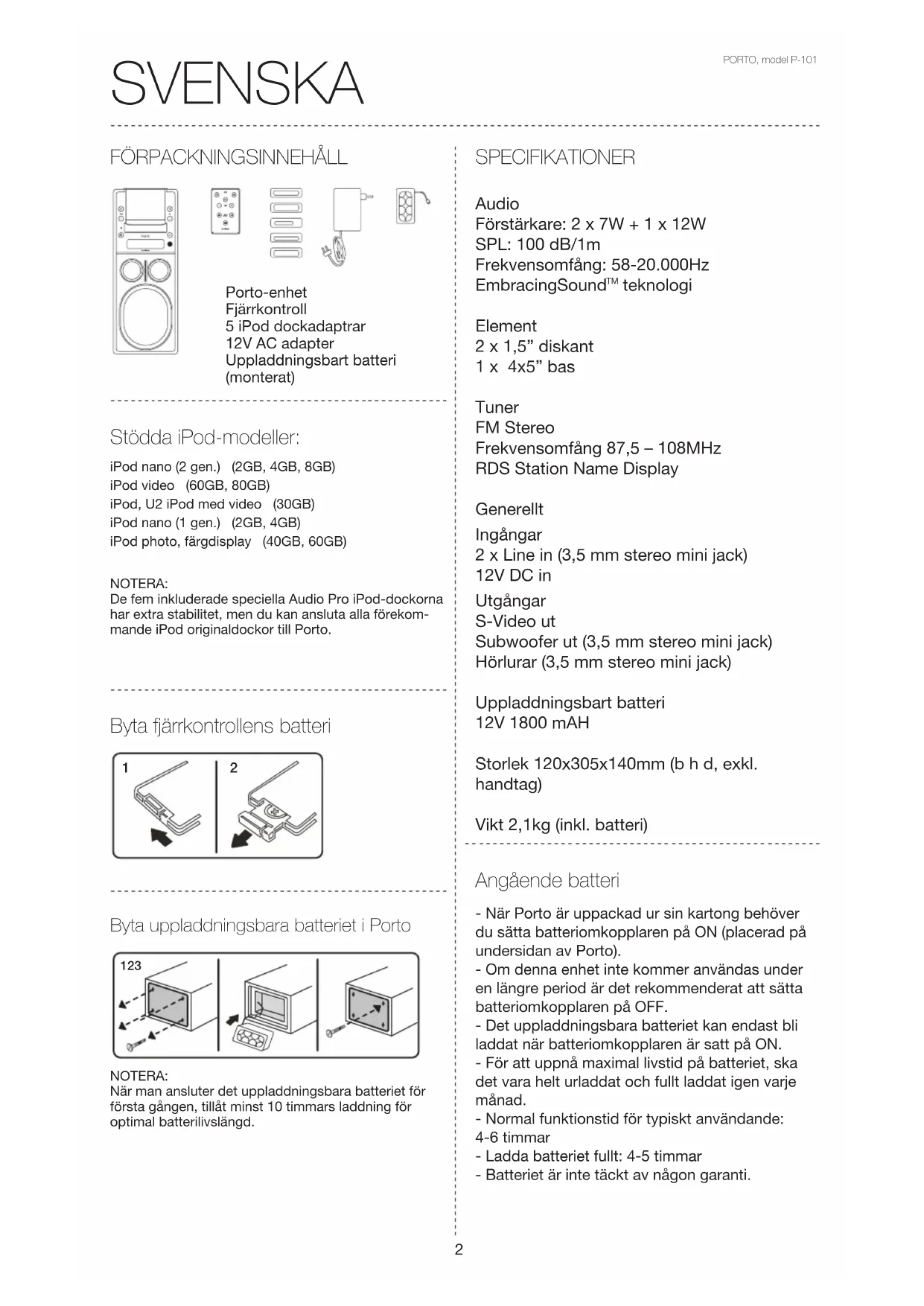 teknologi Element 2 x 1,5” diskant 1 x 4x5” bas Tuner FM Stereo Frekvensomfång 87,5 – 108MHz RDS Station Name Display Generellt Ingångar 2 x Line in (3,5 mm stereo mini jack) 12V DC in Utgångar S-Video ut Subwoofer ut (3,5 mm stereo mini jack) Hörlurar (3,5 mm stereo mini jack) Uppladdningsbart batteri 12V 1800 mAH Storlek 120x305x140mm (b h d, exkl. handtag) Vikt 2,1kg (inkl. batteri) - När Porto är uppackad ur sin kartong behöver du sätta batteriomkopplaren på ON (placerad på undersidan av Porto). - Om denna enhet inte kommer användas under en längre period är det rekommenderat att sätta batteriomkopplaren på OFF. - Det uppladdningsbara batteriet kan endast bli laddat när batteriomkopplaren är satt på ON. - För att uppnå maximal livstid på batteriet, ska det vara helt urladdat och fullt laddat igen varje månad. - Normal funktionstid för typiskt användande: 4-6 timmar - Ladda batteriet fullt: 4-5 timmar - Batteriet är inte täckt av någon garanti. Angående batteri Porto-enhet Fjärrkontroll 5 iPod dockadaptrar 12V AC adapter Uppladdningsbart batteri (monterat) Byta fjärrkontrollens batteri Byta uppladdningsbara batteriet i Porto NOTERA:När man ansluter det uppladdningsbara batteriet för första gången, tillåt minst 10 timmars laddning för optimal batterilivslängd.