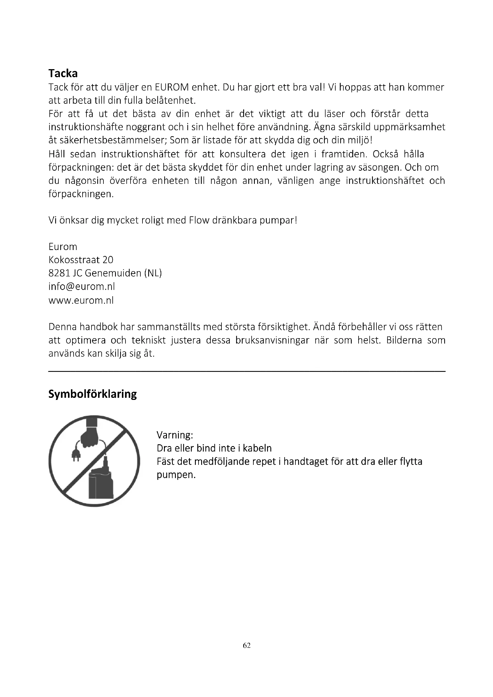 Tacka Tack för att du väljer en EUROM enhet. Du har gjort ett bra val! Vi hoppas att han kommer att arbeta till din fulla belåtenhet. För att få ut det bästa av din enhet är det viktigt att du läser och förstår detta instruktionshäfte noggrant och i sin helhet före användning. Ägna särskild uppmärksamhet åt säkerhetsbestämmelser; Som är listade för att skydda dig och din miljö! Håll sedan instruktionshäftet för att konsultera det igen i framtiden. Också hålla förpackningen: det är det bästa skyddet för din enhet under lagring av säsongen. Och om du någonsin överföra enheten till någon annan, vänligen ange instruktionshäftet och förpackningen. Vi önksar dig mycket roligt med Flow dränkbara pumpar! Eurom Kokosstraat 20 8281 JC Genemuiden (NL) info@eurom.nl www.eurom.nl Denna handbok har sammanställts med största försiktighet. Ändå förbehåller vi oss rätten att optimera och tekniskt justera dessa bruksanvisningar när som helst. Bilderna som används kan skilja sig åt.
