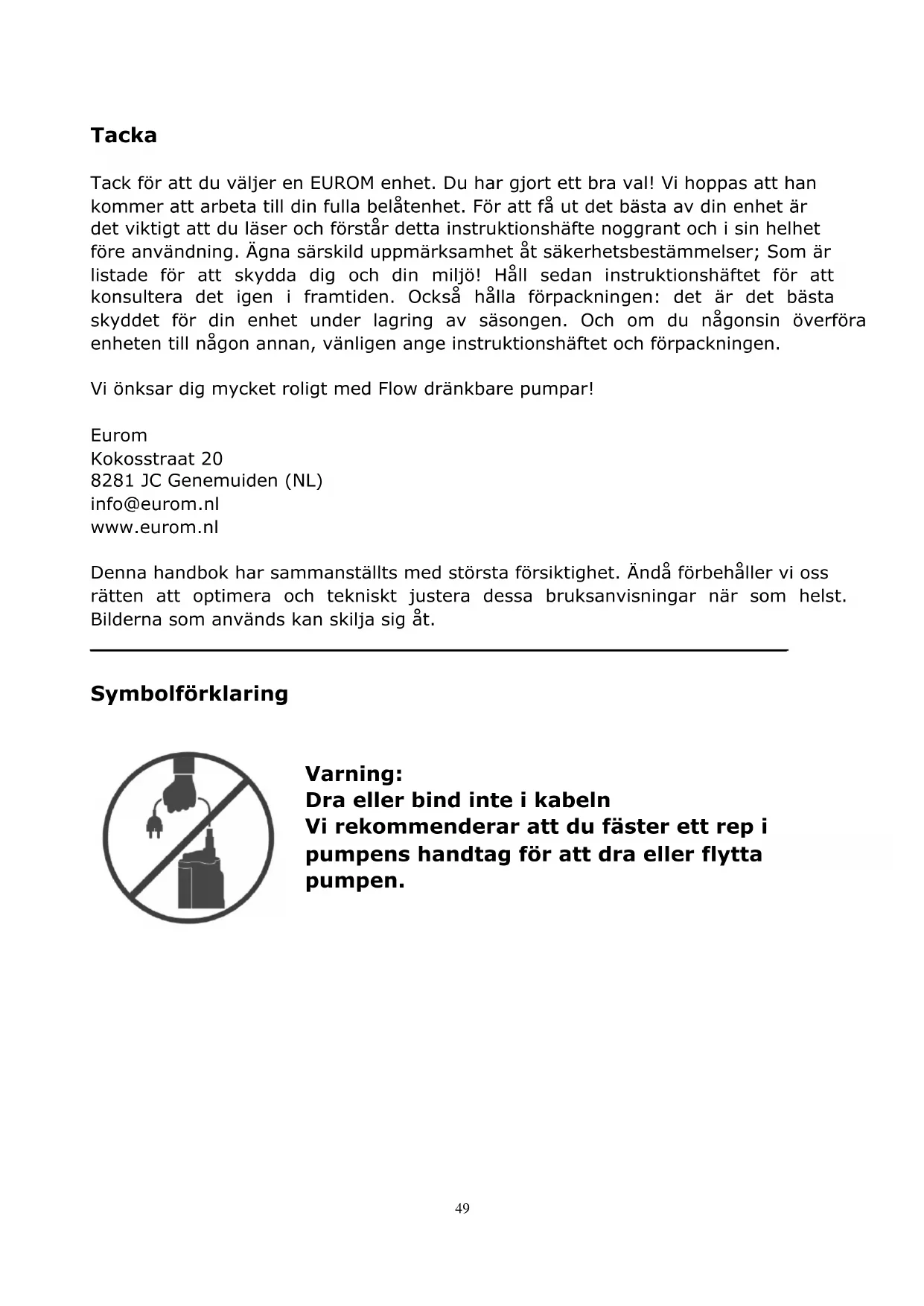 Garanti På den nedsenkbare pumpen du har kjøpt gjelder vanlig garanti for produksjons- og materialfeil. De følgende skadene og feilene dekkes ikke av garantien: Slitasje og defekter på roterende mekaniske tetninger, forårsaket av at pumpen har løpt tørr eller av at vannet har inneholdt spesifikke stoffer eller objekter. At pumpehjulet blokkeres av fremmedobjekter Transportskade Skader forårsaket av uforstandig bruk Feil som er forsøkt reparert av ukyndige, eller som er forårsaket av ukyndige reparasjonsforsøk. Skade oppstått gjennom overoppheting Dersom pumpen åpnes av ikke-godkjent personell, eller det er utført endringer eller lagt til modifikasjoner av pumpen, er garantien og leverandørens, importørens og fabrikantens ansvar ikke lenger å anse som gjeldende. Fjerning I EU betyr dette symbol at dette produktet ikke har blitt bortført med vanlig husholdningsavfall. Afghanere har vært i stand til å skape verdifulle materialer som har blitt brukt tidligere, men har ikke blitt skadet av orgasme skader på døren. Ta avhendte utstyr derfor til en tilordnet innsamlingspunkt eller vend deg til den bedrift hvor du steker på stekeovnen. Han kan ha blitt ansatt for da det er mulig deler av enheten CE-erklæring Se side 74.49 Tacka Tack för att du väljer en EUROM enhet. Du har gjort ett bra val! Vi hoppas att han kommer att arbeta till din fulla belåtenhet. För att få ut det bästa av din enhet är det viktigt att du läser och förstår detta instruktionshäfte noggrant och i sin helhet före användning. Ägna särskild uppmärksamhet åt säkerhetsbestämmelser; Som är listade för att skydda dig och din miljö! Håll sedan instruktionshäftet för att konsultera det igen i framtiden. Också hålla förpackningen: det är det bästa skyddet för din enhet under lagring av säsongen. Och om du någonsin överföra enheten till någon annan, vänligen ange instruktionshäftet och förpackningen. Vi önksar dig mycket roligt med Flow dränkbare pumpar! Eurom Kokosstraat 20 8281 JC Genemuiden (NL) info@eurom.nl www.eurom.nl Denna handbok har sammanställts med största försiktighet. Ändå förbehåller vi oss rätten att optimera och tekniskt justera dessa bruksanvisningar när som helst. Bilderna som används kan skilja sig åt.