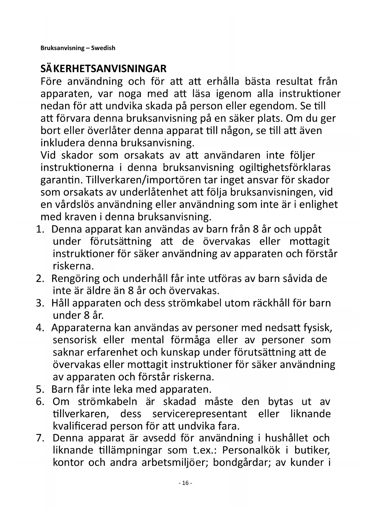 7. Denna apparat är avsedd för användning i hushållet och