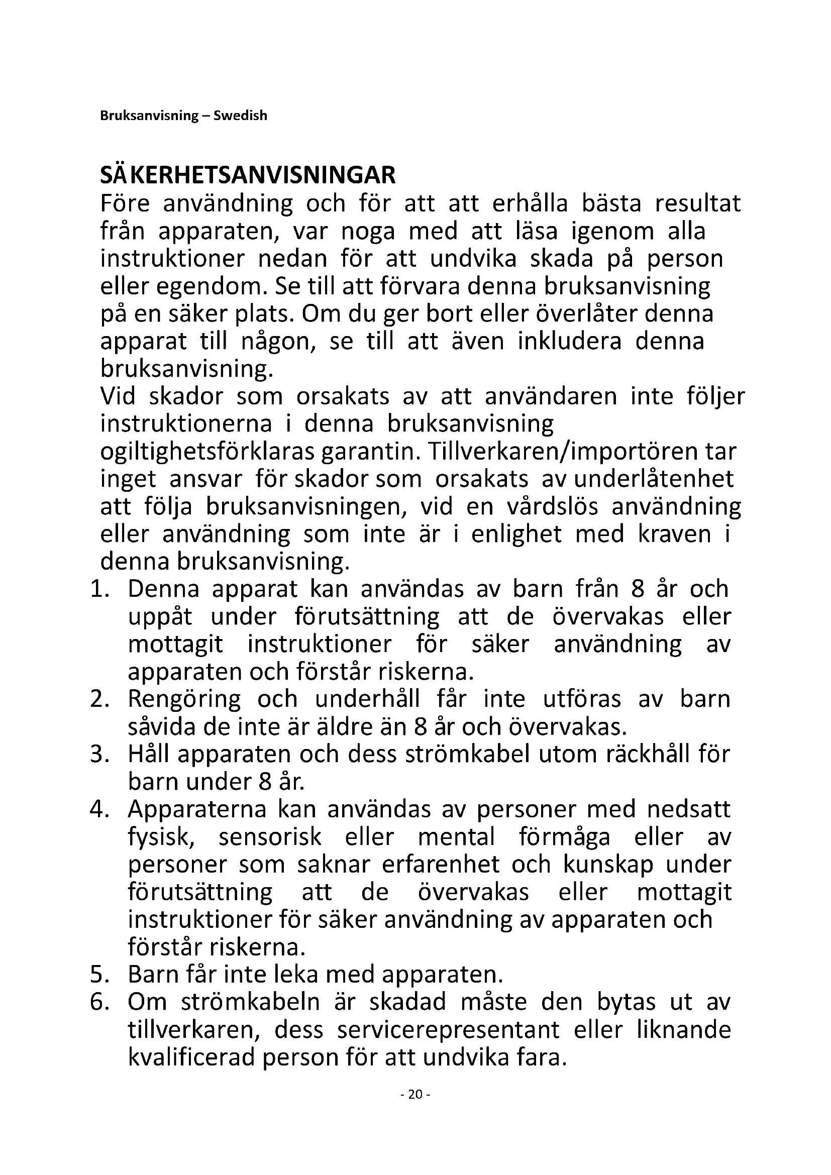 Emerio B.V. Customer service: Kundeninformation: Klantenservice: Zomervaart 1A T: +31 (0) 23 3034369 T: +49 (0) 3222 1097 600 T: +31 (0) 23 3034369 2033 DA Haarlem E: info@emerio.eu E: info.de@emerio.eu E: info.nl@emerio.eu The Netherlands- 20 - Bruksanvisning – Swedish SÄKERHETSANVISNINGAR Före användning och för att att erhålla bästa resultat från apparaten, var noga med att läsa igenom alla instruktioner nedan för att undvika skada på person eller egendom. Se till att förvara denna bruksanvisning på en säker plats. Om du ger bort eller överlåter denna apparat till någon, se till att även inkludera denna bruksanvisning. Vid skador som orsakats av att användaren inte följer instruktionerna i denna bruksanvisning ogiltighetsförklaras garantin. Tillverkaren/importören tar inget ansvar för skador som orsakats av underlåtenhet att följa bruksanvisningen, vid en vårdslös användning eller användning som inte är i enlighet med kraven i denna bruksanvisning.