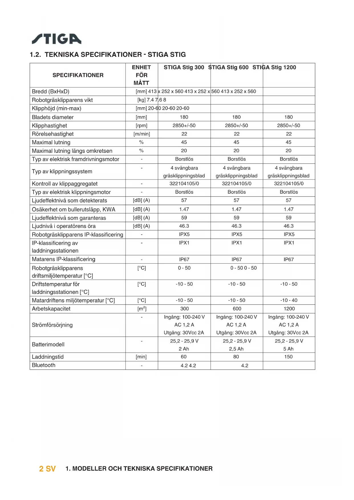 1.2. TEKNISKASPECIFIKATIONER-STIGASTIG SPECIFIKATIONER ENHET FÖR MÅTT STIGAStig300 STIGAStig600 STIGAStig1200 Bredd (BxHxD) [mm] 413 x 252 x 560 413 x 252 x 560 413 x 252 x 560 Robotgräsklipparens vikt [kg] 7.4 7.6 8 Klipphöjd (min-max) [mm] 20-60 20-60 20-60 Bladets diameter [mm] 180 180 180 Klipphastighet [rpm] 2850+/-50 2850+/-50 2850+/-50 Rörelsehastighet [m/min] 22 22 22 Maximal lutning % 45 45 45 Maximal lutning längs omkretsen % 20 20 20 Typ av elektrisk framdrivningsmotor - Borstlös Borstlös Borstlös Typ av klippningssystem - 4 svängbara gräsklippningsblad 4 svängbara gräsklippningsblad 4 svängbara gräsklippningsblad Kontroll av klippaggregatet - 322104105/0 322104105/0 322104105/0 Typ av elektrisk klippningsmotor - Borstlös Borstlös Borstlös Ljudeektnivå som detekterats [dB] (A) 57 57 57 Osäkerhet om bullerutsläpp, KWA [dB] (A) 1.47 1.47 1.47 Ljudeektnivå som garanteras [dB] (A) 59 59 59 Ljudnivå i operatörens öra [dB] (A) 46.3 46.3 46.3 Robotgräsklipparens IP-klassicering