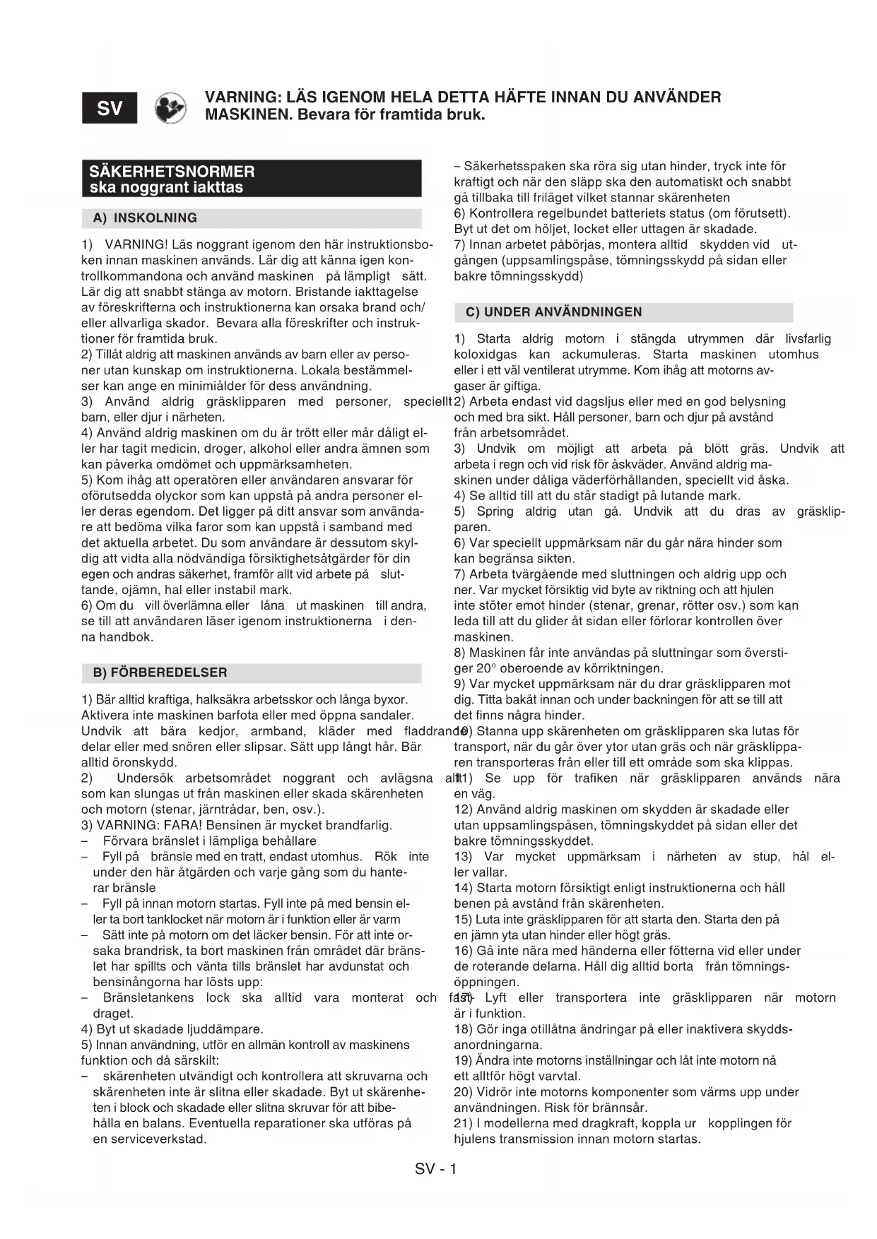 Oštećenje ili su neki delovi popustili Zaustaviti mašinu i otkačiti kabal svećice Proveriti da nema eventualnih oštećenja Proveriti ima li delova koji su popustili i pritegnuti ih Izvršiti provere, zamene ili popravke u specijalizo- vanom serisu U slučaju bilo kakave nedoumice ili problema, pozovite od- mah najbližu servisnu službu ili Vašeg prodavca.SV - 1 SÄKERHETSNORMER ska noggrant iakttas A) INSKOLNING 1) VARNING! Läs noggrant igenom den här instruktionsbo- ken innan maskinen används. Lär dig att känna igen kon- trollkommandona och använd maskinen på lämpligt sätt. Lär dig att snabbt stänga av motorn. Bristande iakttagelse av föreskrifterna och instruktionerna kan orsaka brand och/ eller allvarliga skador. Bevara alla föreskrifter och instruk- tioner för framtida bruk. 2) Tillåt aldrig att maskinen används av barn eller av perso- ner utan kunskap om instruktionerna. Lokala bestämmel- ser kan ange en minimiålder för dess användning. 3) Använd aldrig gräsklipparen med personer, speciellt barn, eller djur i närheten. 4) Använd aldrig maskinen om du är trött eller mår dåligt el- ler har tagit medicin, droger, alkohol eller andra ämnen som kan påverka omdömet och uppmärksamheten. 5) Kom ihåg att operatören eller användaren ansvarar för oförutsedda olyckor som kan uppstå på andra personer el- ler deras egendom. Det ligger på ditt ansvar som använda- re att bedöma vilka faror som kan uppstå i samband med det aktuella arbetet. Du som användare är dessutom skyl- dig att vidta alla nödvändiga försiktighetsåtgärder för din egen och andras säkerhet, framför allt vid arbete på slut- tande, ojämn, hal eller instabil mark. 6) Om du vill överlämna eller låna ut maskinen till andra, se till att användaren läser igenom instruktionerna i den- na handbok.