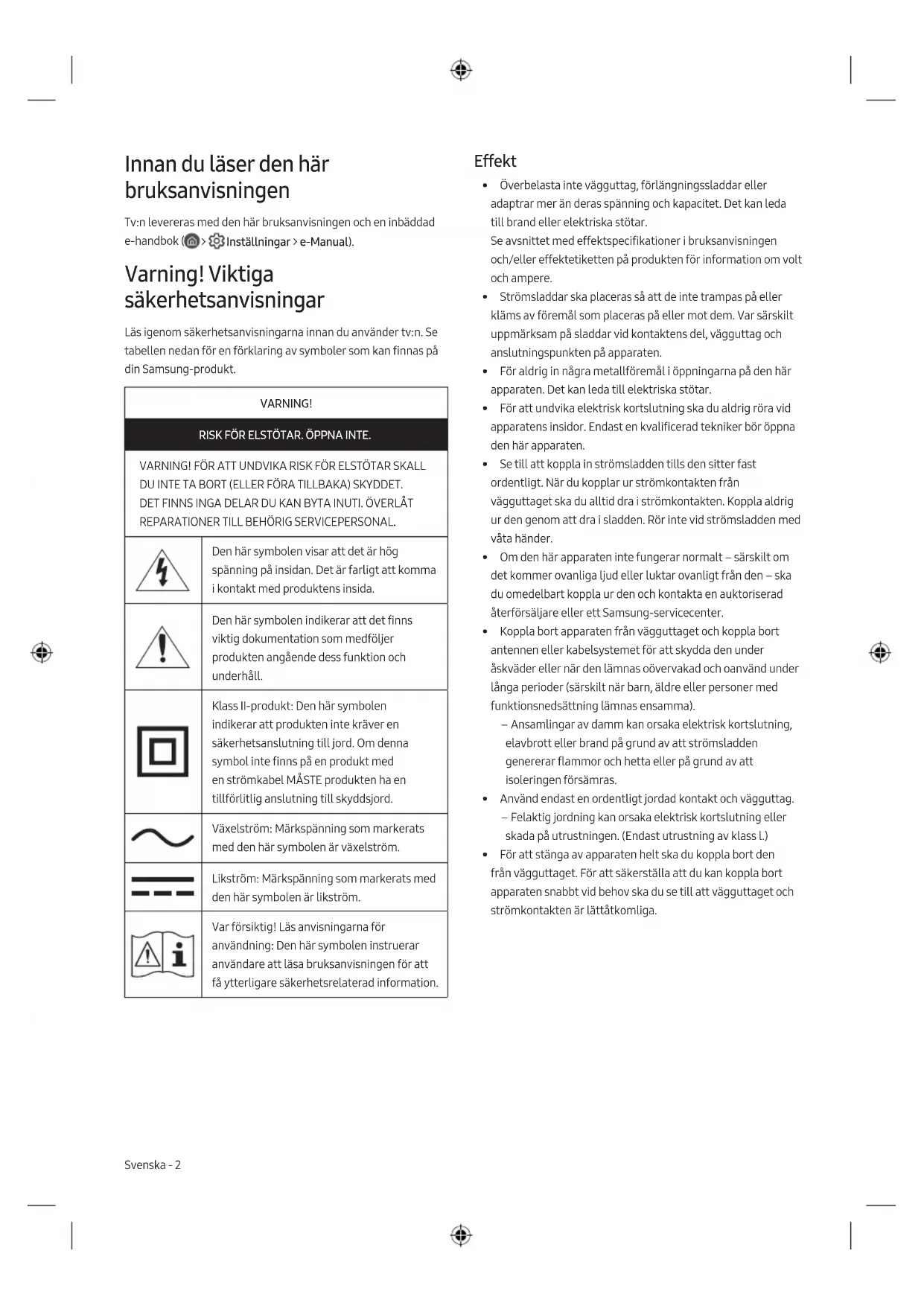 - Aus Sicherheitsgründen dürfen Sie nicht versuchen, den Akku zu entnehmen. Wird der Akku nicht ordnungsgemäß entfernt, kann dies zu Schäden an Akku und Gerät, zu Verletzungen und/oder zu einer Beeinträchtigung der Sicherheit des Geräts führen. Deutsch - 8Diese Seite wurde absichtlich leer belassen.Innan du läser den här bruksanvisningen Tv:n levereras med den här bruksanvisningen och en inbäddad e-handbok ( > Inställningar > e-Manual). Varning! Viktiga säkerhetsanvisningar Läs igenom säkerhetsanvisningarna innan du använder tv:n. Se tabellen nedan för en förklaring av symboler som kan finnas på din Samsung-produkt. VARNING! RISK FÖR ELSTÖTAR. ÖPPNA INTE. VARNING! FÖR ATT UNDVIKA RISK FÖR ELSTÖTAR SKALL DU INTE TA BORT (ELLER FÖRA TILLBAKA) SKYDDET. DET FINNS INGA DELAR DU KAN BYTA INUTI. ÖVERLÅT REPARATIONER TILL BEHÖRIG SERVICEPERSONAL. Den här symbolen visar att det är hög spänning på insidan. Det är farligt att komma i kontakt med produktens insida. Den här symbolen indikerar att det finns viktig dokumentation som medföljer produkten angående dess funktion och underhåll. Klass II-produkt: Den här symbolen indikerar att produkten inte kräver en säkerhetsanslutning till jord. Om denna symbol inte finns på en produkt med en strömkabel MÅSTE produkten ha en tillförlitlig anslutning till skyddsjord. Växelström: Märkspänning som markerats med den här symbolen är växelström. Likström: Märkspänning som markerats med den här symbolen är likström. Var försiktig! Läs anvisningarna för användning: Den här symbolen instruerar användare att läsa bruksanvisningen för att få ytterligare säkerhetsrelaterad information. Effekt