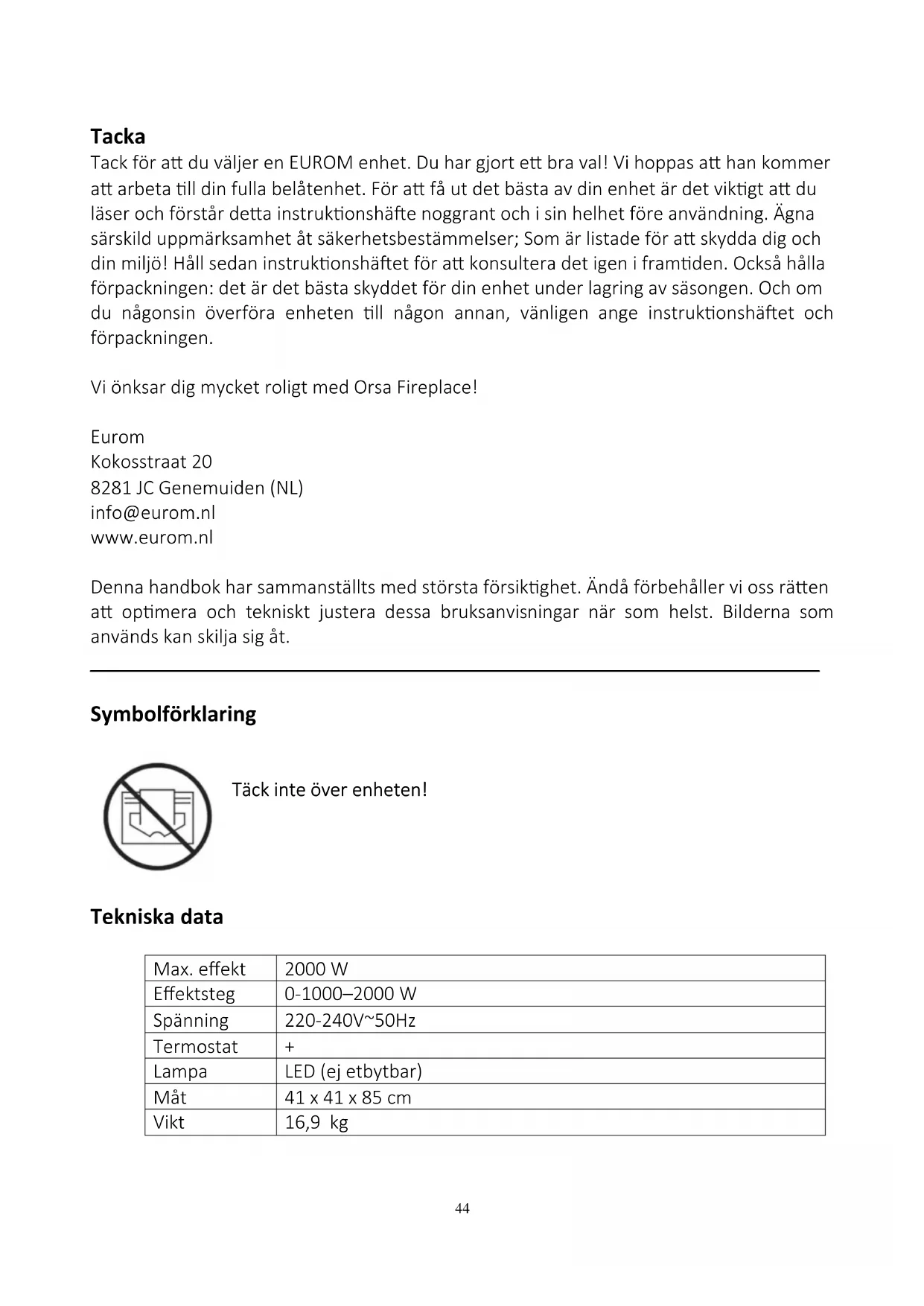 Tacka Tack för att du väljer en EUROM enhet. Du har gjort ett bra val! Vi hoppas att han kommer att arbeta till din fulla belåtenhet. För att få ut det bästa av din enhet är det viktigt att du läser och förstår detta instruktionshäfte noggrant och i sin helhet före användning. Ägna särskild uppmärksamhet åt säkerhetsbestämmelser; Som är listade för att skydda dig och din miljö! Håll sedan instruktionshäftet för att konsultera det igen i framtiden. Också hålla förpackningen: det är det bästa skyddet för din enhet under lagring av säsongen. Och om du någonsin överföra enheten till någon annan, vänligen ange instruktionshäftet och förpackningen. Vi önksar dig mycket roligt med Orsa Fireplace! Eurom Kokosstraat 20 8281 JC Genemuiden (NL) info@eurom.nl www.eurom.nl Denna handbok har sammanställts med största försiktighet. Ändå förbehåller vi oss rätten att optimera och tekniskt justera dessa bruksanvisningar när som helst. Bilderna som används kan skilja sig åt.