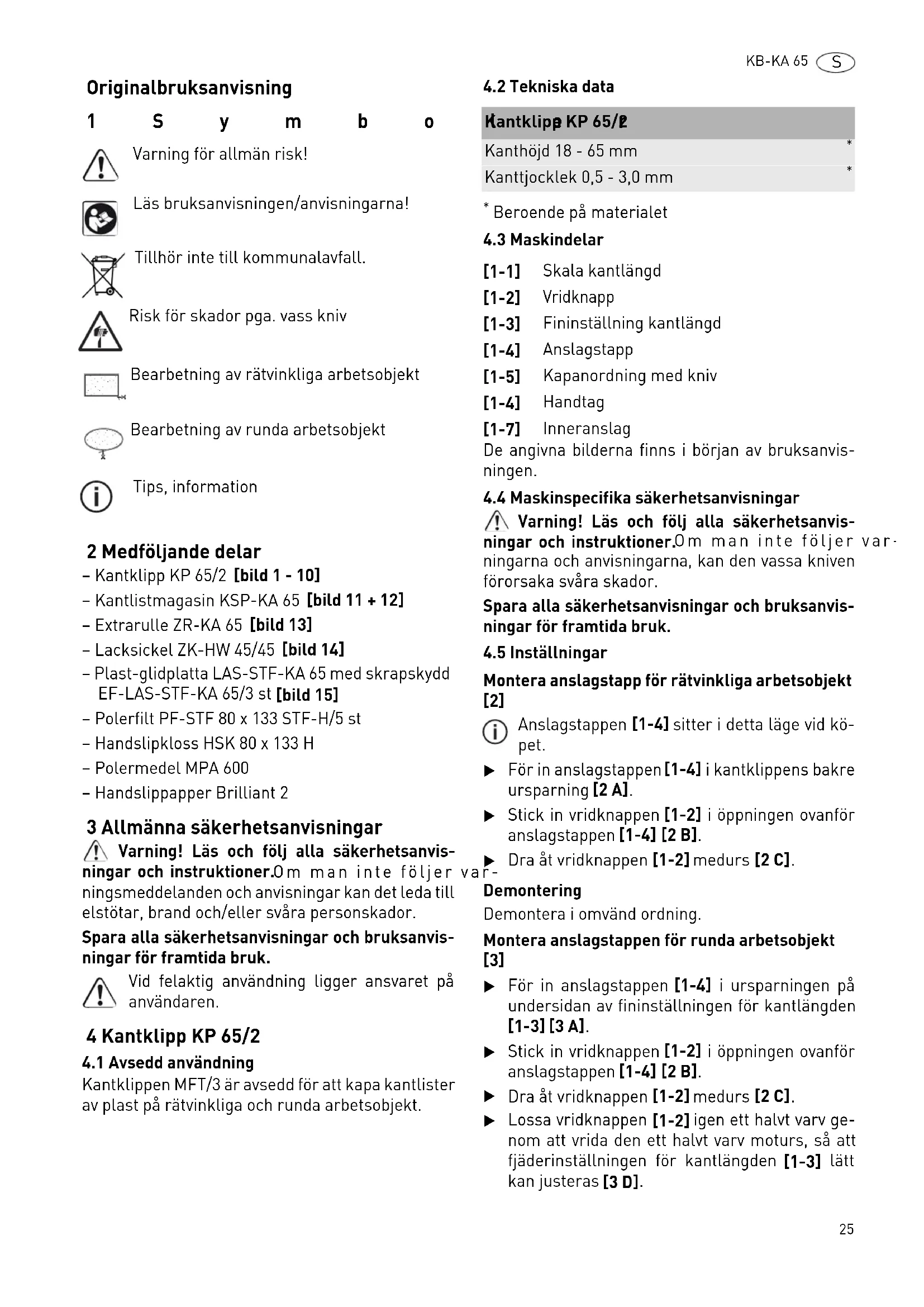 Originalbruksanvisning 1Symboler 2 Medföljande delar – Kantklipp KP 65/2 [bild 1 - 10] – Kantlistmagasin KSP-KA 65 [bild 11 + 12] – Extrarulle ZR-KA 65 [bild 13] – Lacksickel ZK-HW 45/45 [bild 14] – Plast-glidplatta LAS-STF-KA 65 med skrapskydd EF-LAS-STF-KA 65/3 st [bild 15] – Polerfilt PF-STF 80 x 133 STF-H/5 st – Handslipkloss HSK 80 x 133 H – Polermedel MPA 600 – Handslippapper Brilliant 2 3 Allmänna säkerhetsanvisningar Varning! Läs och följ alla säkerhetsanvis- ningar och instruktioner. Om man inte följer var- ningsmeddelanden och anvisningar kan det leda till elstötar, brand och/eller svåra personskador. Spara alla säkerhetsanvisningar och bruksanvis- ningar för framtida bruk. Vid felaktig användning ligger ansvaret på användaren. 4 Kantklipp KP 65/2