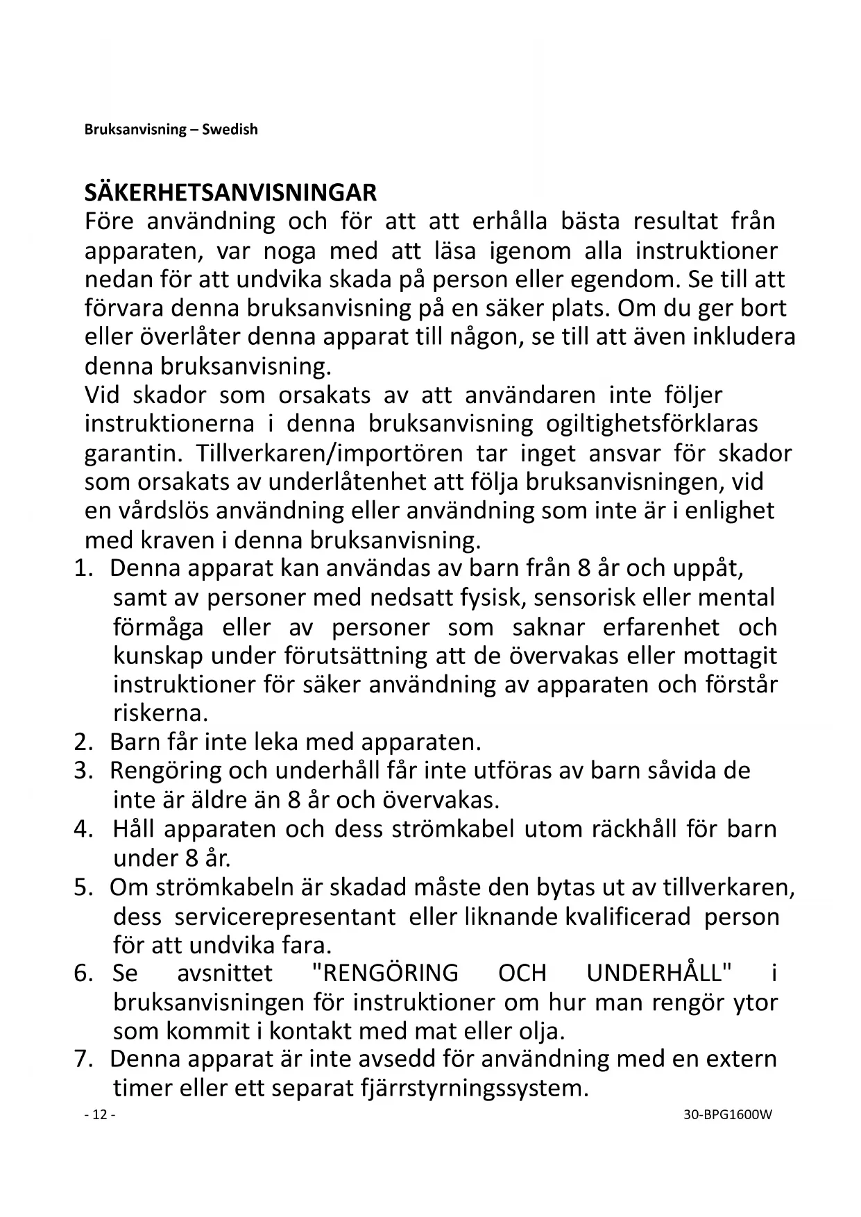 Resirkulering – EU-direktiv 2012/19/EU Dette symbolet indikerer at produktet ikke skal kastes sammen med husholdningsavfall. For å hindre mulig skade på miljø eller helse fra ukontrollert avfallshåndtering, resirkuleres det ansvarlig for å fremme bærekraftig gjenbruk av materialressurser. For å returnere din brukte enhet, bruk stedlige retur og innsamlingssystemer eller kontakt forhandleren der produktet ble kjøpt. De kan sørge for at dette produktet blir miljømessig og trygt resirkulert. Fun Nordic ApS Egelund 8 6200 Aabenraa Denmark www.funnordic.dk- 12 - 30-BPG1600W Bruksanvisning – Swedish SÄKERHETSANVISNINGAR Före användning och för att att erhålla bästa resultat från apparaten, var noga med att läsa igenom alla instruktioner nedan för att undvika skada på person eller egendom. Se till att förvara denna bruksanvisning på en säker plats. Om du ger bort eller överlåter denna apparat till någon, se till att även inkludera denna bruksanvisning. Vid skador som orsakats av att användaren inte följer instruktionerna i denna bruksanvisning ogiltighetsförklaras garantin. Tillverkaren/importören tar inget ansvar för skador som orsakats av underlåtenhet att följa bruksanvisningen, vid en vårdslös användning eller användning som inte är i enlighet med kraven i denna bruksanvisning.