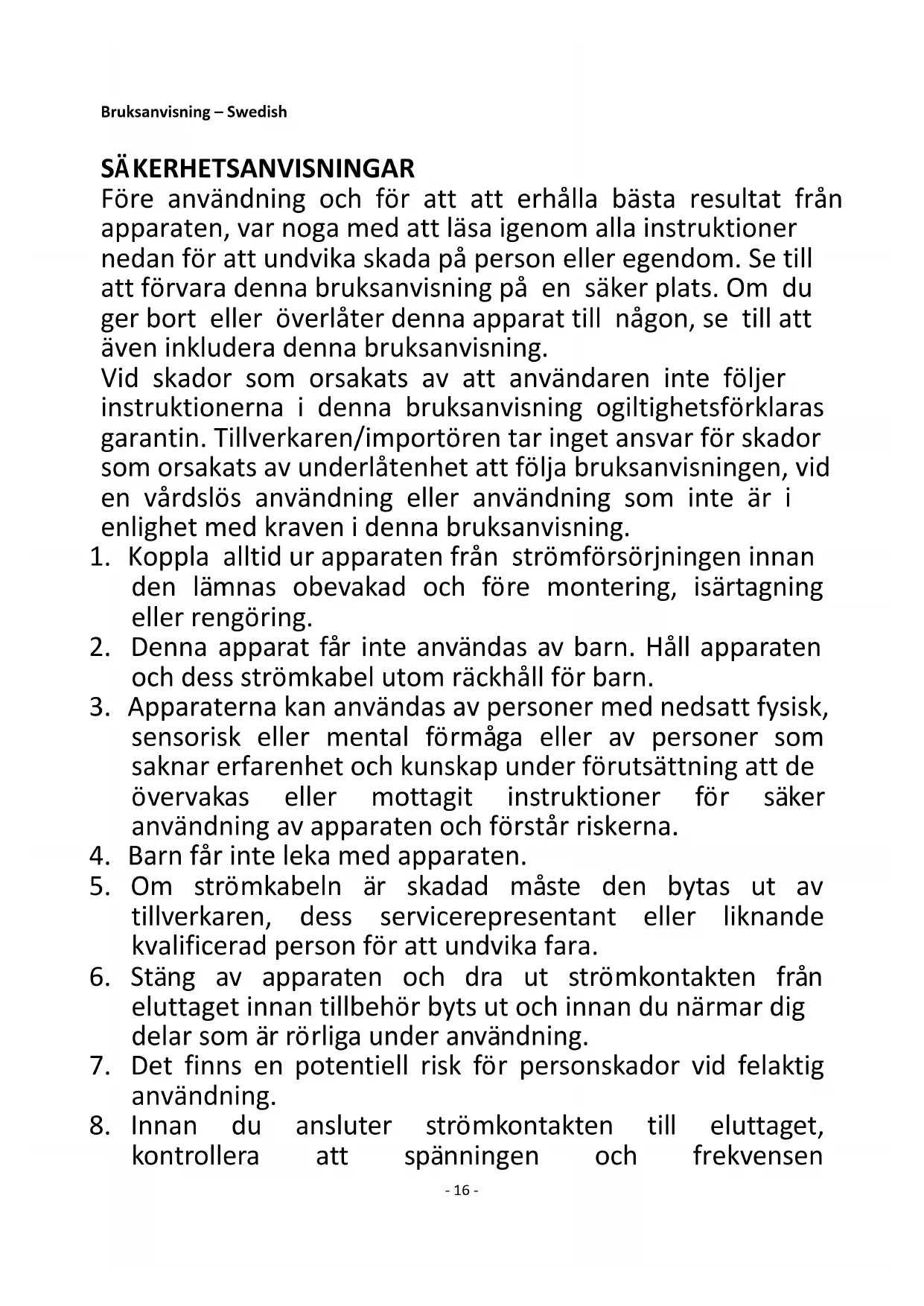 15. Du får inte koppla in eller dra ut apparaten från eluttaget