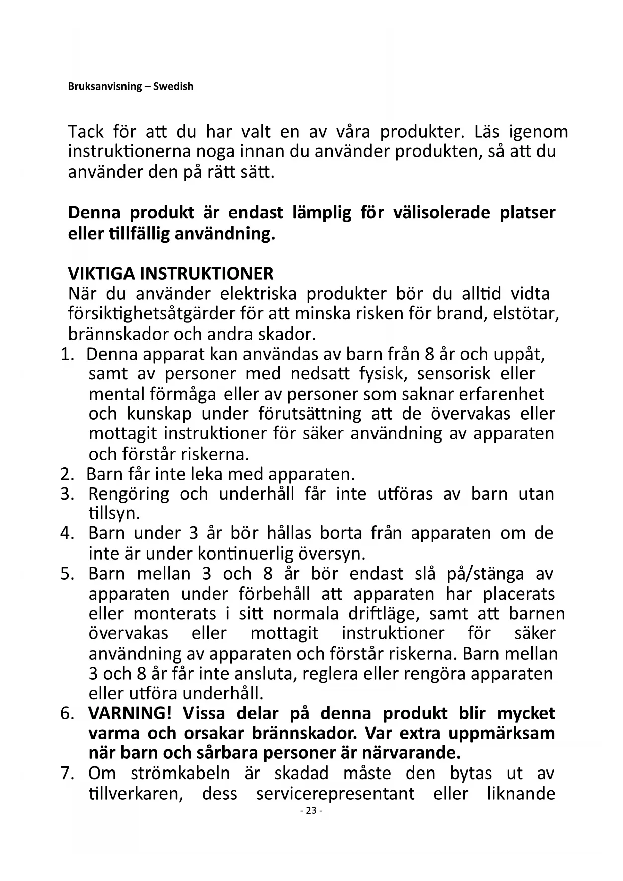 valfri knapp på displayen för att tända displayen igen. Knapparnas funktion är endast aktiverad när skärmen är tänd. Timer Automatisk påslagning: När ström är ansluten, tryck på för att ställa in automatisk påslagningstid. Använd "+" eller "-" för att ställa in om hur många timmar som elementet ska slås på automatiskt. Automatisk avstängning: När elementet är påslaget kan du trycka på för att ställa in automatisk avstängningstid. Använd "+" eller "-" för att ställa in om hur många timmar som elementet ska stängas av automatiskt. Anmärkningar: Ett knapptryck ändrar tiden med en timme. Tidsintervallen kan ställas in från 1 timme till 24 timmar. Efter att timern ställts in för automatisk påslagning eller avstängning visas ikonen på displayen. Du kan endast justera tiden när numrena blinkar. Tiden är inställd när numrena inte längre blinkar. ECO-läge När elementet är påslaget, tryck på "ECO" för att försätta elementet i ECO-läget. Tryck på "ECO" igen för att avsluta ECO-läget till elementets standardinställning. I ECO-läget justerar apparaten automatiskt värmeeffekten efter omgivningstemperaturen. När omgivningstemperaturen är högre än 28 ℃ stoppas uppvärmningen. I ECO-läget kan du inte justera temperaturen eller värmeeffekten manuellt. En lövliknande ikon visas på displayen för att visa att ECO-läget är aktiverat. Barnlås När elementet är påslaget, tryck in länge tills det hörs 3 pipljud för att aktivera barnläget. Inställningen på elemenet är därmed låst. För att avsluta barnlåset, håll in tills de 3 pipljuden hörs igen. I barnläget visas en barnliknande ikon på displayen.- 28 - FJÄRRSTYRNING Denna enhet har ett fjärrstyrdon, som drivs av ett CR2025-batteri. Funktionerna hos knapparna på fjärrstyrdonet är desamma som för knapparna på manöverpanelen. SÄKERHETSSYSTEM Detta element har en säkerhetsanordning för tippskydd. Säkerhetsfunktionen tiltskydd stänger automatiskt av elementet när det lutas. Av säkerhetsskäl stängs även elementet automatiskt av om det placeras på en ojämn yta eller lutas av misstag.