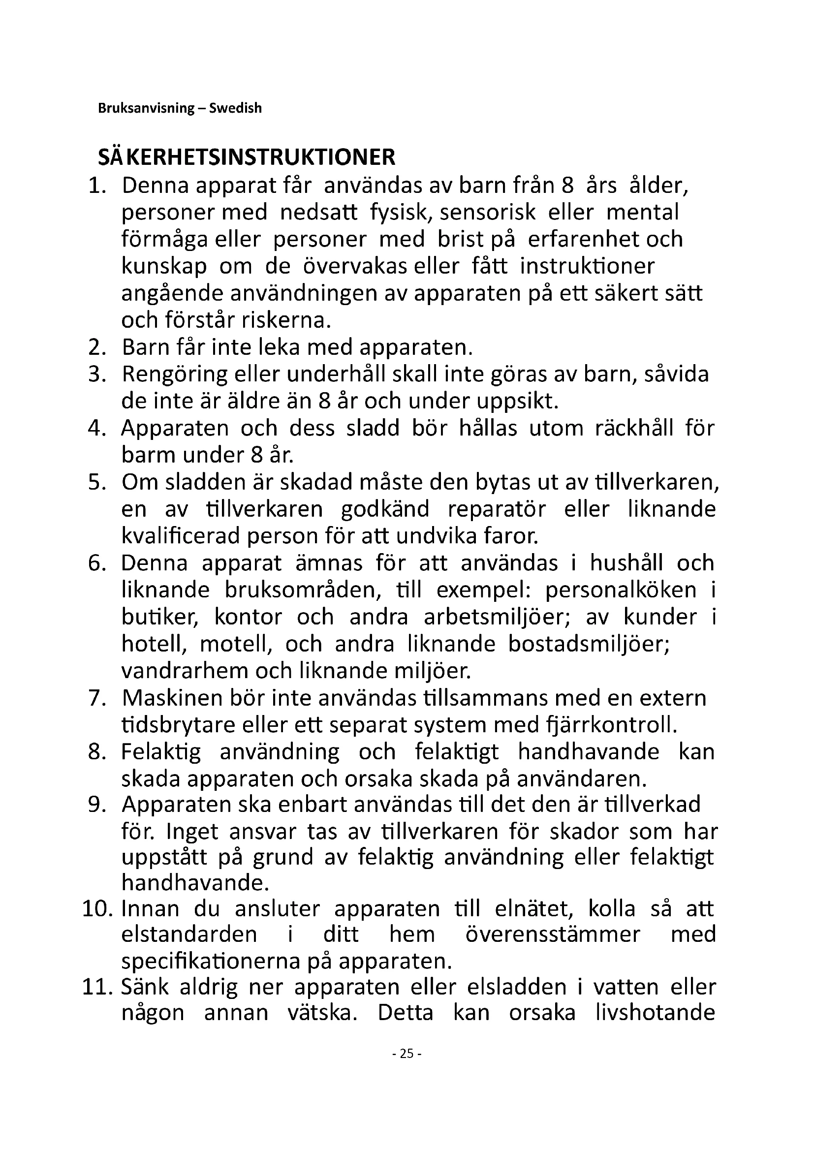 9. Apparaten ska enbart användas till det den är tillverkad