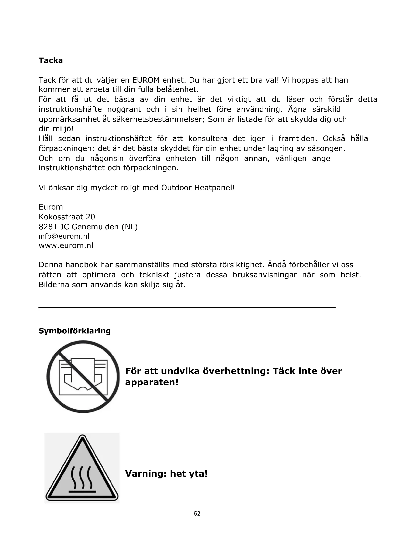 Användning Outdoor Heatpanel Om allting är som det ska kan du slå på apparaten eller sätta i kontakten i strömuttaget. Apparaten sätts nu på. När apparaten slagits på dröjer det ungefär 15 minuter innan den värmts upp till den normala driftstemperaturen. För att stänga av apparaten slår du av den eller drar ut kontakten ur uttaget. Låt apparaten svalna. Användning Outdoor Heatpanel 1800+2400+3200 (RC) Sätt strömbrytaren på 0: av. Om allting är som det ska kan du ansluta apparaten till elnätet med den externa strömbrytaren (eller sätta i kontakten i strömuttaget). Använd strömbrytaren för att ställa in apparaten utifrån hur du vill använda den: I = handstyrd II = fjärrkontroll Handstyrd användning Sätt strömbrytaren på I: kontrollampan tänds. Apparaten sätts nu på. När apparaten slagits på dröjer det ungefär 15 minuter innan den värmts upp till den normala driftstemperaturen. För att stänga av apparaten sätter du strömbrytaren på O igen. Slå av strömförsörjningen med den externa strömbrytaren eller dra ut kontakten ur uttaget. Fjärrkontroll Sätt strömbrytaren på II: apparaten är nu i standbyläget. Sätt i två små batterier (AAA – 1,5 V) i fjärrkontrollen. Rikta fjärrkontrollen mot apparaten och tryck på ON-knappen. Kontrollampan börjar lysa blått. Apparaten sätts nu på. När apparaten slagits på dröjer det ungefär 15 minuter innan den värmts upp till den normala driftstemperaturen. För att stänga av apparaten riktar du fjärrkontrollen mot den och tryck på OFF- knappen. Apparaten är i standbyläget igen. För att stänga av apparaten sätter du strömbrytaren på O igen. Slå av strömförsörjningen med den externa strömbrytaren eller dra ut kontakten ur uttaget. Om du använder apparaten för första gången (eller igen efter ett långt uppehåll) bör du hålla apparaten under noggrann uppsikt under de första 20 till 30 minuterna för att säkerställa att den fungerar problemfritt. Första gången du använder apparaten (eller när du inte har använt den på länge) kan det komma vit rök ur den. Detta är normalt och upphör efter några minuter. När apparaten värms upp kan det knastra lite. Även detta är harmlöst. Rengöring, underhåll och service När apparaten hänger utomhus är det viktigt att rengöra den regelbundet. Genom att rengöra den förlänger man dess livslängd och ser till att den fungerar effektivt. Det är dessutom ett garantivillkor.74 Rengör apparaten (oberoende av omgivningen) varannan eller var tredje vecka. I en salthaltig omgivning ska den rengöras varje vecka. Salt i luften kan inverka på apparaten och orsaka rost och korrosion i metallen. Men även i en stadsomgivning inverkar luftföroreningar på beläggningar och andra material som ska skydda apparaten mot rost och korrosion. Du bör utföra en grundlig rengöring och kontroll var tredje månad. Tänk på att väder och vind, luftföroreningar och i förekommande fall salt, cigarettrök, oljelampor, stearinljus, grillar osv. kan lämna spår på apparaten med tiden. Obs! Du ska alltid slå av apparaten, ta ut kontakten ur strömuttaget och låta apparaten svalna (1 timme) innan du rengör den. Eftersom apparaten uppnår skyddsklass IPX4 kan den utan problem rengöras med (varmt) vatten. Du ska dock inte använda någon högtrycksspruta, utan endast rengöra apparaten med en våt trasa. Om du väljer att använda ett milt rengöringsmedel ska du noggrant avlägsna alla tvålrester efteråt. Torka av apparaten med en ren, mjuk trasa som inte luddar eller en mjuk borste. Använd aldrig aggressiva rengöringsmedel, svampar eller borstar, och inte heller några kemiska rengöringsmedel. Detta kan skada materialet. Använd aldrig brännbara rengöringsmedel, som exempelvis tvättbensin eller sprit. Se alltid till att kontakten och elkabeln förblir torra. Glöm inte att rengöra apparatens baksida – även där kan det finnas insektsrester, fågelspillning, damm, salt och annan smuts. Kontrollera om det finns fukt på apparaten eller om den uppvisar några andra brister innan du använder den igen. Kontrollera apparaten regelbundet, framför allt varje gång när den har utsatts för kraftiga vindar eller andra ovanliga händelser som kan påverka apparatens funktion. Apparaten har inga delar som behöver underhållas eller som kan bytas ut/repareras av användaren. Eventuella reparationer måste utföras av utbildade fackmän (återförsäljaren eller en auktoriserad elektriker) för att garantera att det sker på ett säkert sätt. Skador och störningar som uppstått till följd av reparationer eller ändringar av apparaten som användaren själv har utfört, olyckor, olämplig användning, oaktsamhet, felaktigt eller otillräckligt underhåll och kommersiell användning medför att garantin upphör att gälla. Avfallshantering Inom EU innebär denna symbol att produkten inte få kastas som vanliga hushållssopor. Gammal utrustning innehåller värdefulla material, lämpligt för recycling. Dessa material bör göras tillgänglig för återvinning för att förhindra negativ påverkan på hälsa och miljö p.g.a. okontrollerad sophämtning. Vänligen lämna därför gammal utrustning till därför avsedda insamlingsställen. Alternativt, kontakta den ursprungliga leverantören som kan se till att så många komponenter som möjligt kan återvinnas.75 CE-deklaration Jag, umderteclmade: Eurom, Kokosstraat 20, 8281JC Genemuiden-NL härmed förklara att produkten nedan Produkt: Infraröd värmare Känd under varumärket: Eurom typer: Outdoor Heatpanel 1800, Outdoor Heatpanel (RC), Outdoor Heatpanel 2400 (RC), Outdoor Heatpanel 3200 (RC) uppyller kraven i följande standarder: LVD 2014/35/EU EN60335-1:2012+A11:2014 EN60335-2-30:2009+A11:2012 EN62233:2008 EMC 2014/30/EU EN55014-1:2017 EN55014-2:2015 EN61000-3-2:2014 EN61000-3-3:2013 RoHS 2011/65/EU&(EU)2015/863 Genemuiden, 28-09-2020 W.J. Bakker, alg. dir.76 Děkujeme D