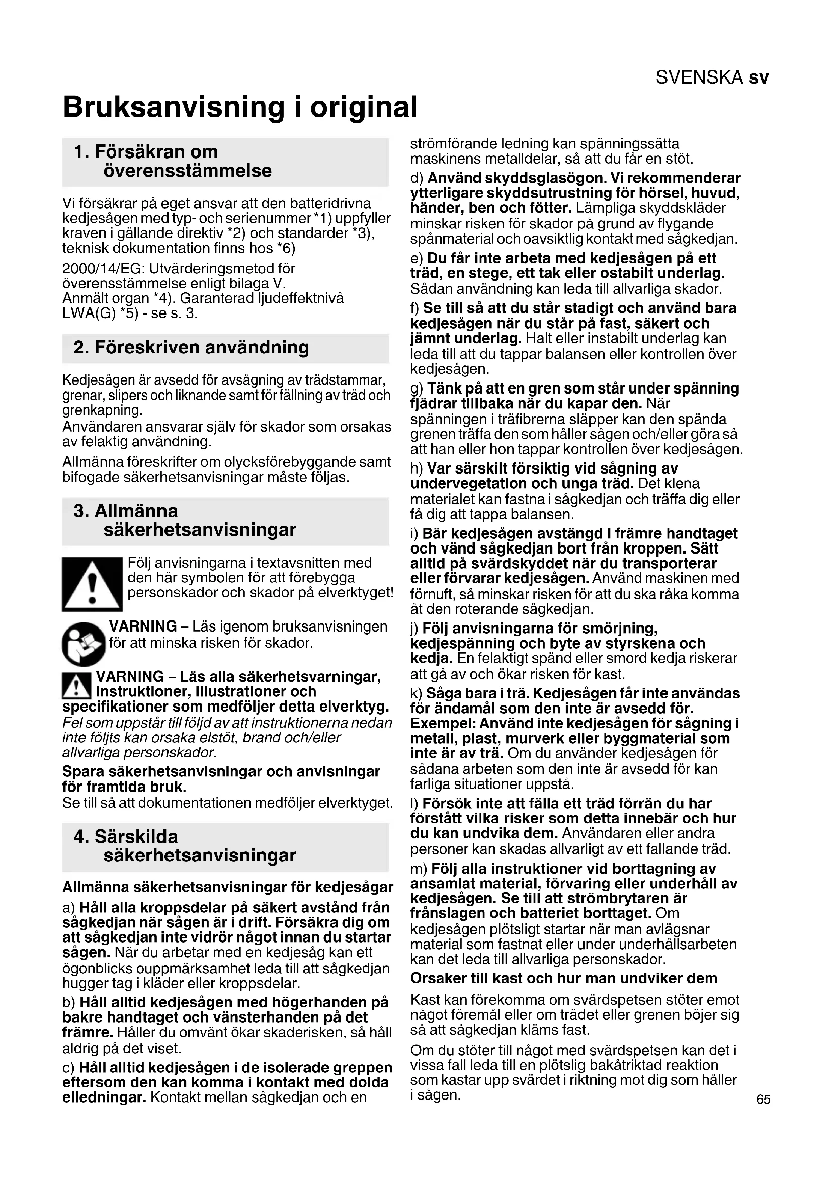 Bruksanvisning i original Vi försäkrar på eget ansvar att den batteridrivna kedjesågen med typ- och serienummer *1) uppfyller kraven i gällande direktiv *2) och standarder *3), teknisk dokumentation finns hos *6) 2000/14/EG: Utvärderingsmetod för överensstämmelse enligt bilaga V. Anmält organ *4). Garanterad ljudeffektnivå LWA(G) *5) - se s. 3. Kedjesågen är avsedd för avsågning av trädstammar, grenar, slipers och liknande samt för fällning av träd och grenkapning. Användaren ansvarar själv för skador som orsakas av felaktig användning. Allmänna föreskrifter om olycksförebyggande samt bifogade säkerhetsanvisningar måste följas. Följ anvisningarna i textavsnitten med den här symbolen för att förebygga personskador och skador på elverktyget! VARNING – Läs igenom bruksanvisningen för att minska risken för skador. VARNING – Läs alla säkerhetsvarningar, instruktioner, illustrationer och specifikationer som medföljer detta elverktyg. Fel som uppstår till följd av att instruktionerna nedan inte följts kan orsaka elstöt, brand och/eller allvarliga personskador. Spara säkerhetsanvisningar och anvisningar för framtida bruk. Se till så att dokumentationen medföljer elverktyget. Allmänna säkerhetsanvisningar för kedjesågar a) Håll alla kroppsdelar på säkert avstånd från sågkedjan när sågen är i drift. Försäkra dig om att sågkedjan inte vidrör något innan du startar sågen. När du arbetar med en kedjesåg kan ett ögonblicks ouppmärksamhet leda till att sågkedjan hugger tag i kläder eller kroppsdelar. b) Håll alltid kedjesågen med högerhanden på bakre handtaget och vänsterhanden på det främre. Håller du omvänt ökar skaderisken, så håll aldrig på det viset. c) Håll alltid kedjesågen i de isolerade greppen eftersom den kan komma i kontakt med dolda elledningar. Kontakt mellan sågkedjan och en strömförande ledning kan spänningssätta maskinens metalldelar, så att du får en stöt. d) Använd skyddsglasögon. Vi rekommenderar ytterligare skyddsutrustning för hörsel, huvud, händer, ben och fötter. Lämpliga skyddskläder minskar risken för skador på grund av flygande spånmaterial och oavsiktlig kontakt med sågkedjan. e) Du får inte arbeta med kedjesågen på ett träd, en stege, ett tak eller ostabilt underlag. Sådan användning kan leda till allvarliga skador. f) Se till så att du står stadigt och använd bara kedjesågen när du står på fast, säkert och jämnt underlag. Halt eller instabilt underlag kan leda till att du tappar balansen eller kontrollen över kedjesågen. g) Tänk på att en gren som står under spänning fjädrar tillbaka när du kapar den. När spänningen i träfibrerna släpper kan den spända grenen träffa den som håller sågen och/eller göra så att han eller hon tappar kontrollen över kedjesågen. h) Var särskilt försiktig vid sågning av undervegetation och unga träd. Det klena materialet kan fastna i sågkedjan och träffa dig eller få dig att tappa balansen.