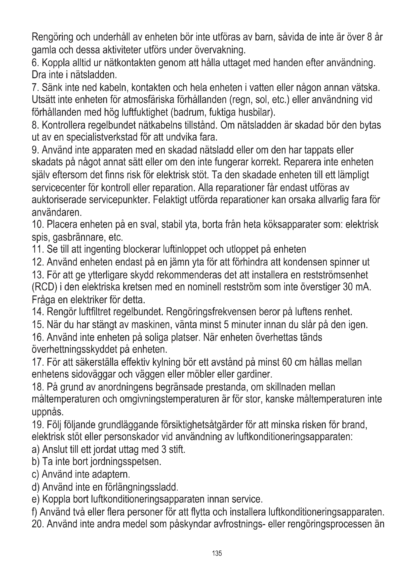 elektrisk stöt eller personskador vid användning av luftkonditioneringsapparaten: a) Anslut till ett jordat uttag med 3 stift. b) Ta inte bort jordningsspetsen. c) Använd inte adaptern. d) Använd inte en förlängningssladd. e) Koppla bort luftkonditioneringsapparaten innan service. f) Använd två eller flera personer för att flytta och installera luftkonditioneringsapparaten.